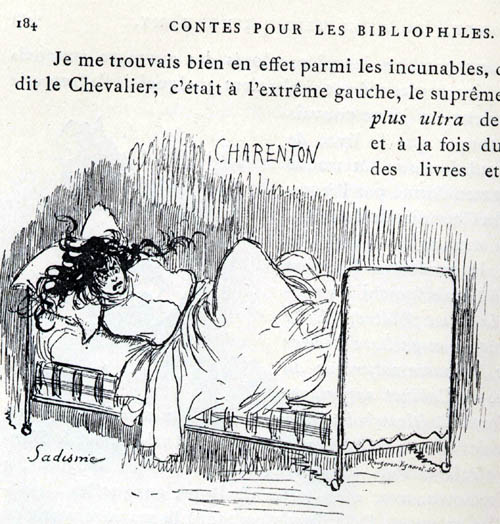 Sauf erreur de ma part (cette exposition est tellement vaste !), le rôle de Octave Uzanne comme précurseur (bien timide il est vrai) de la réédition des oeuvres de Sade n’est pas mentionné. En 1878, Uzanne publie une préface à une édition de Idée sur les Romans par le Marquis de Sade. Officiellement, il s’insurge contre l’immoralité de Sade, mais sa proposition de soumettre l’oeuvre du Marquis à la loi de Lynch est joliment ambigüe, Albert Lynch étant un des illustrateurs de prédilection des livres d’Uzanne. Il est dommage que l’exposition ait omis de montrer le dessin « Sadisme » d’Albert Robida que l’on trouvera dans Contes pour les bibliophiles, Librairies-réunies, Paris, 1895, co-signé par Uzanne avec le caricatursite, qui lui même fit preuve d’une délectation satirique pour les supplices et autres cruautés. (Voir André LANGE « Le rire et l’effroi. Supplices et massacres orientaux dans l’oeuvre d’Albert Robida« , in Antonio Dominguez Leiva et Muriel Detrie (éd.), Le supplice oriental dans la littérature et les arts, Editions du Murmure, Neuilly-lès-Dijon, 2005). En 1901, Octave Uzanne publia une préface de 24 pages, intitulée « L’idée de Sadisme et L’érotologie scientifique » à l’ouvrage du Dr. Eugène Duerhren Le Marquis de Sade et son temps. Etudes relatives à l’histoire de la civilisation et des moeurs du XVIIIe siècle, traduit de l’allemand par le Dr. A. Weber-Riga.