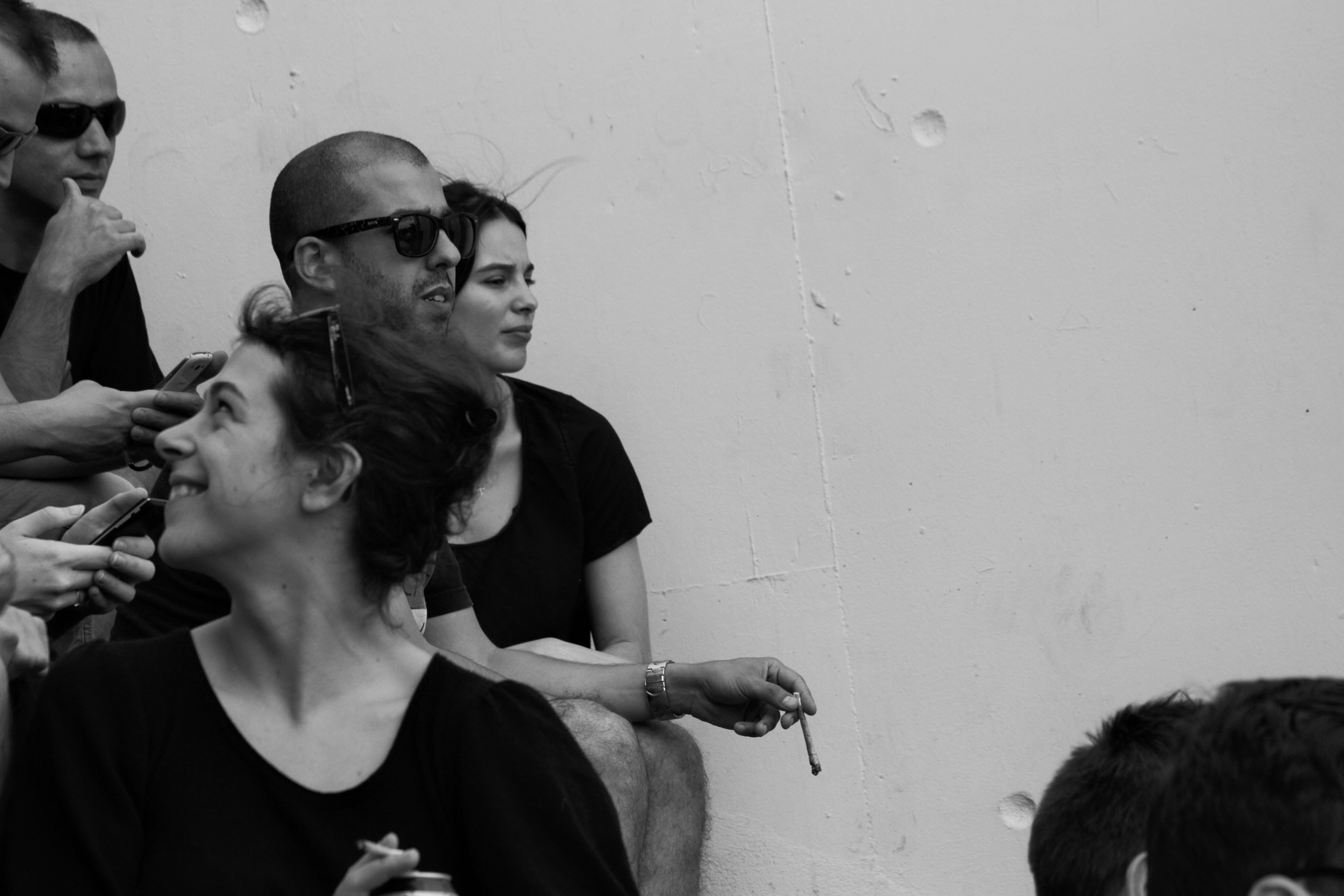 Pour l’occasion, j’ai amené un télé-objectif. Une jeune fille derrière moi s’inquiète : « Vous avez le droit à l’image ? ». Je lui réponds : « Tout le monde à droit à l’image ». Mais c’est un malentendu. Elle s’inquiète de sa vie privée, ce qui est normal. Je tords sa question mal ficelée pour défendre le droit des photographes. La musique a repris et je ne me risque pas à lui expliquer la jurisprudence Bannier, qui, en France, protège le travail des photographes. Je lui dis simplement : « On a le droit de prendre des images, tant qu’il n’y a pas intention de nuire ». C’est un peu simple, mais paraît la rassurer. « Vous êtes photographe ? » Je lui montre l’appareil : « Oui ». Elle a oublié d’ajouter « professionnel ». « Et qu’est-ce que vous allez en faire de ces photos ? » « Essayer de les rendre jolies, puis les publier sur un blog ». Elle sourit. Et moi, dans mon for intérieur, je me dis qu’avec la présence alentour de tant de jolies filles, il me sera difficile de ne pas faire de jolies photos.