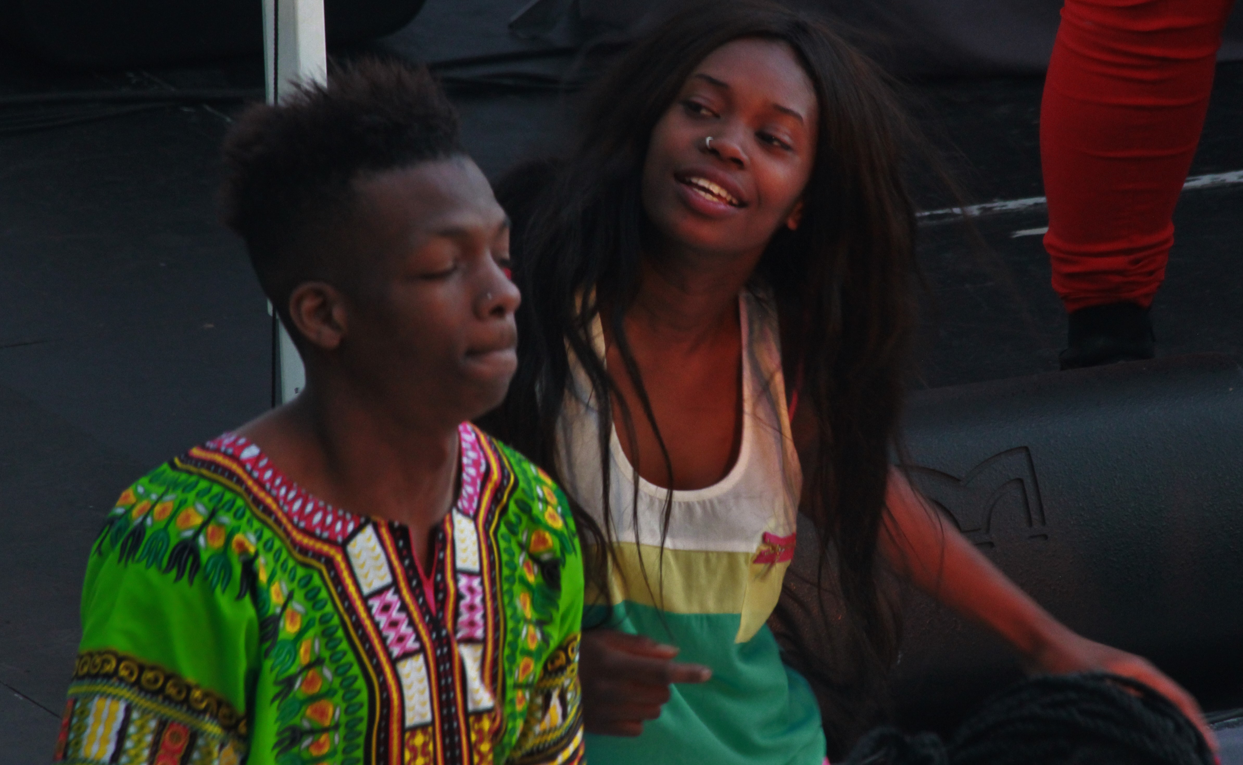 Ce soir, soirée d’été, nous allons au Parc, où se déroule le Festival Irrueption offert par l’association Belleville Citoyenne. Rap et hip hop en life, c’est assez inédit pour moi. Nous nous installons en haut de l’amphithéâtre, excellent poste d’observation. Le public est en majorité jeune, des 15-25 ans, quelques enfants, deux ou trois vieux. Beaucoup de noirs, quelques arabes et des loulous nouveau style.
