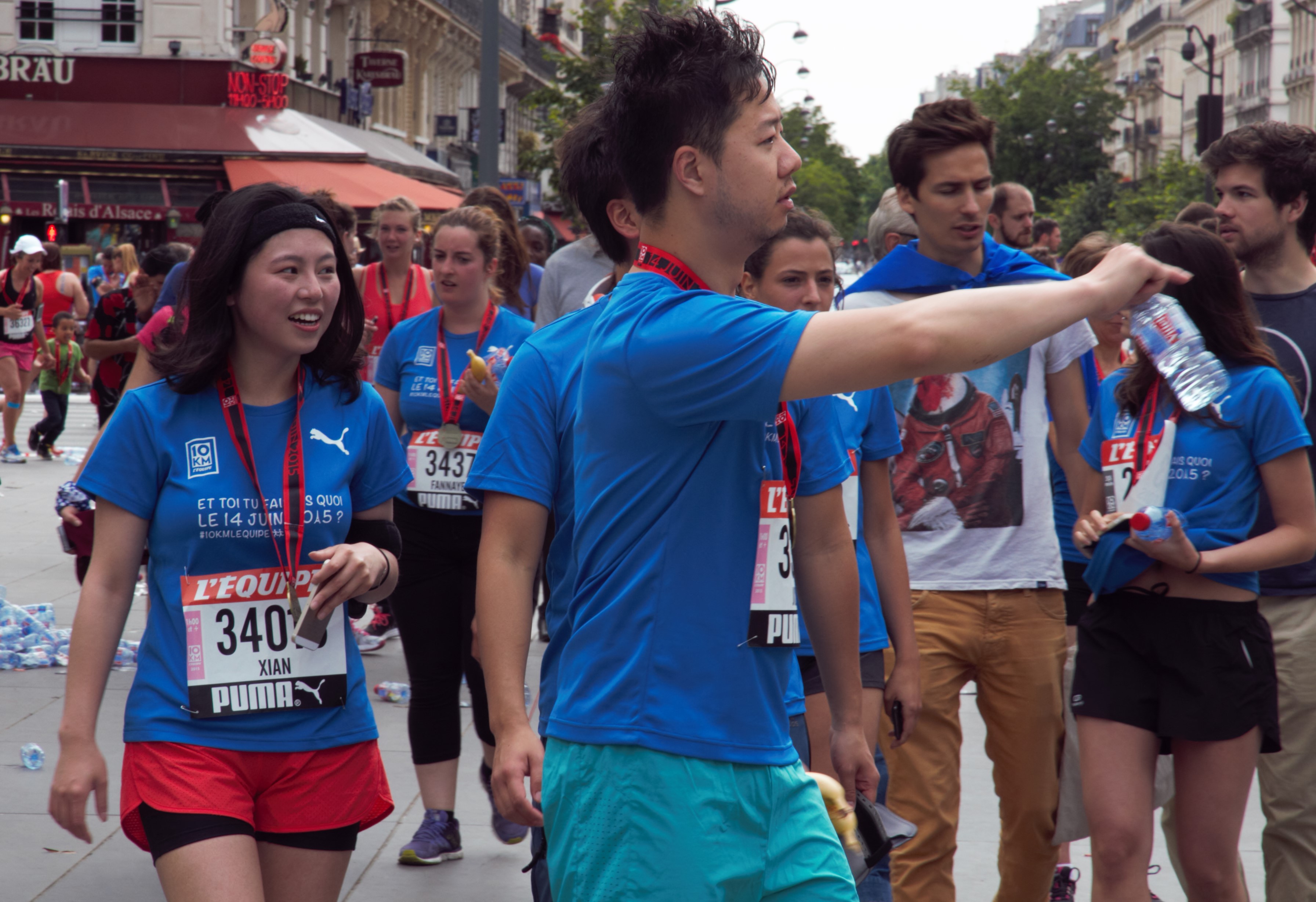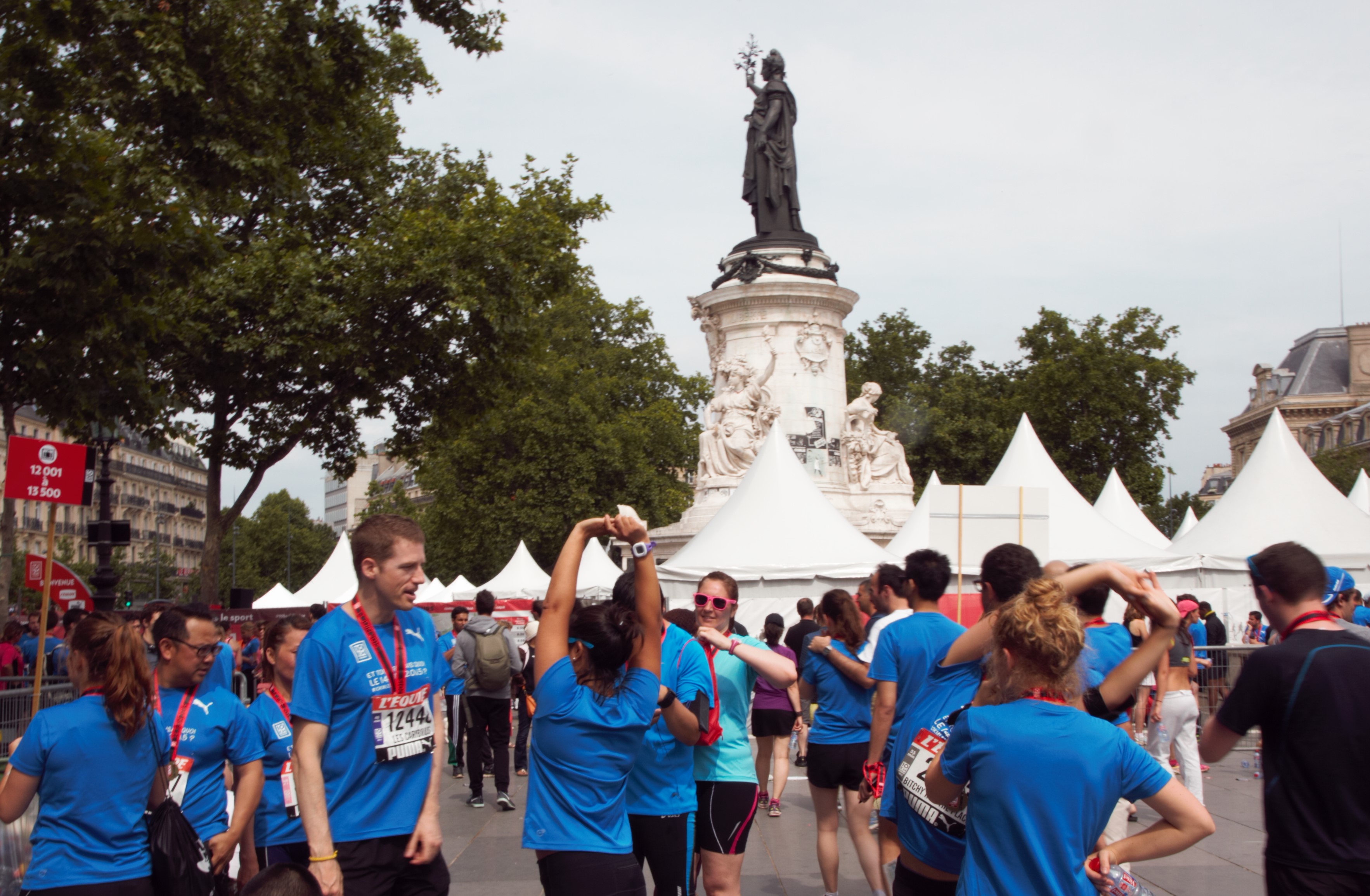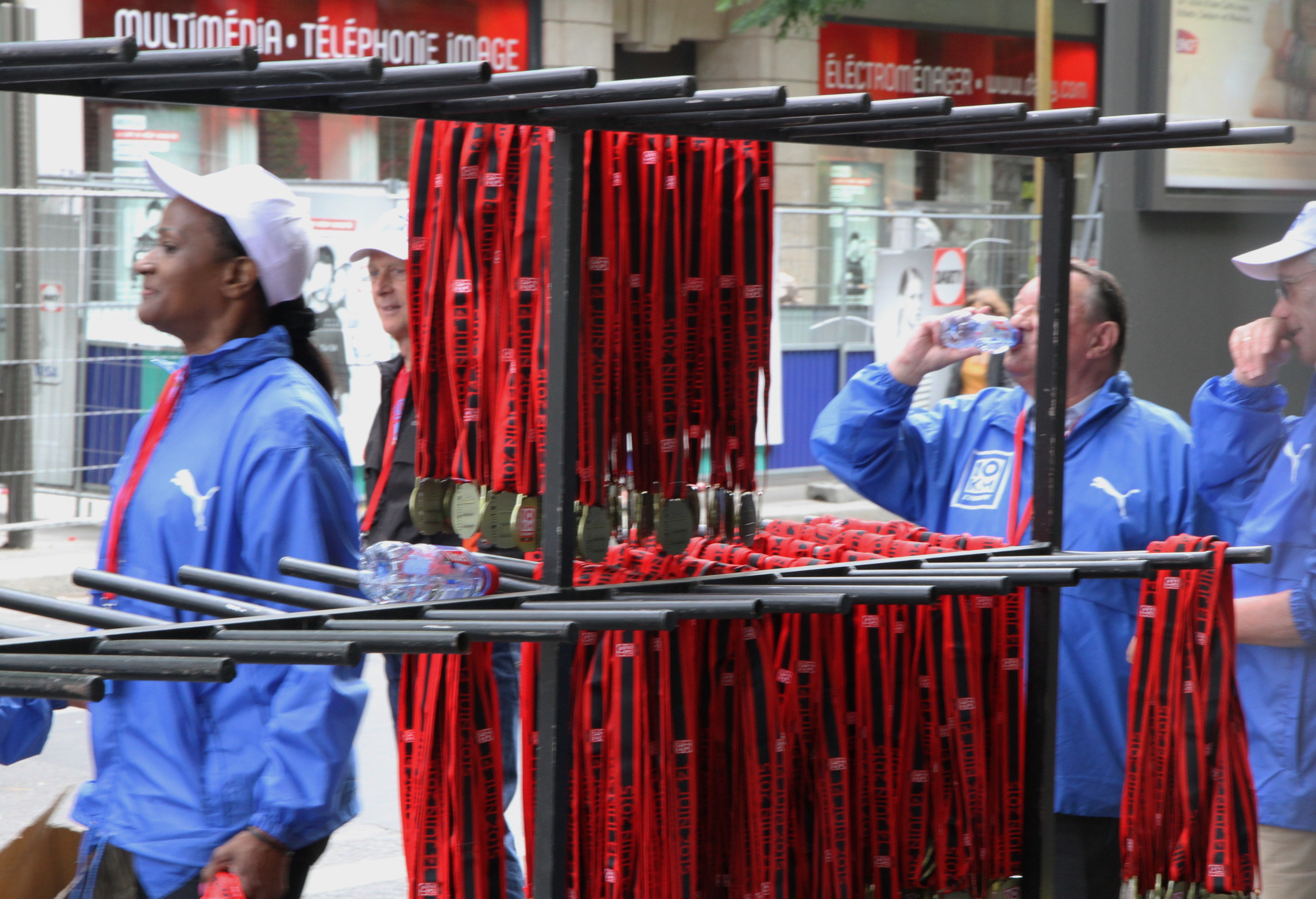 Cette fois, j’ai raté l’événement. La vie locale va à un tel rythme. Ce dimanche matin, Mina ouvre les fenêtres. Il y a des clameurs sur l’avenue, des roulements de tambours, des sirènes. Juste le temps d’empoigner mon Canon et me voilà descendu. Trop tard ! La dernière coureuse des 10 km de Paris vient de passer, suivie des voitures balais. Un orphéon pose ses cuivres sur le trottoir. Je prends le métro jusqu’à République, me disant que la RATP me permettra de rattraper la course. Peine perdue, les couloirs de la station sont déjà pleins de jeunes hommes et de jeunes femmes essoufflés. La Place de la République est couverte de vidanges en plastique. Moins de monde que pour Charlie, quand même. Ici, chacun à sa médaille. Celles non distribuées pendent sur un étal. Leur cordon rouge me rappelle celui des petites offrandes taoistes qui attendent leur destin dans le Temple de l’Est, à Pékin. Dans l’équipe « La première fois », il y a des jolies filles. Plus loin, l »équipe de l’Association pour le droit de mourir dans la dignité se fait un selfie rigolo. J’achète un billet de tombola qui me donne l’adresse du bal des pompiers ; le 14 juillet approche. Perdu. Je remonte l’Avenue, en cours de nettoyage. Un peu d’exercice, le dimanche matin, cela fait du bien. Boulevard Richard-Lenoir, un marabout enveloppé dans une feuille d’or, félicite ses potes. Rue Oberkampf, devant la vitrine d’un alfarrabiste, je rate une photo que j’aurais aimé dédicacer à mon ami Charles François, dont je parlerai bientôt. Une coureuse soulage ses crampes dans une position scabreuse ; derrière elle un bouquin tape l’oeil, La psychanalyse sans divan. Reportage fichu. La prochaine fois, je lirai L’Equipe.