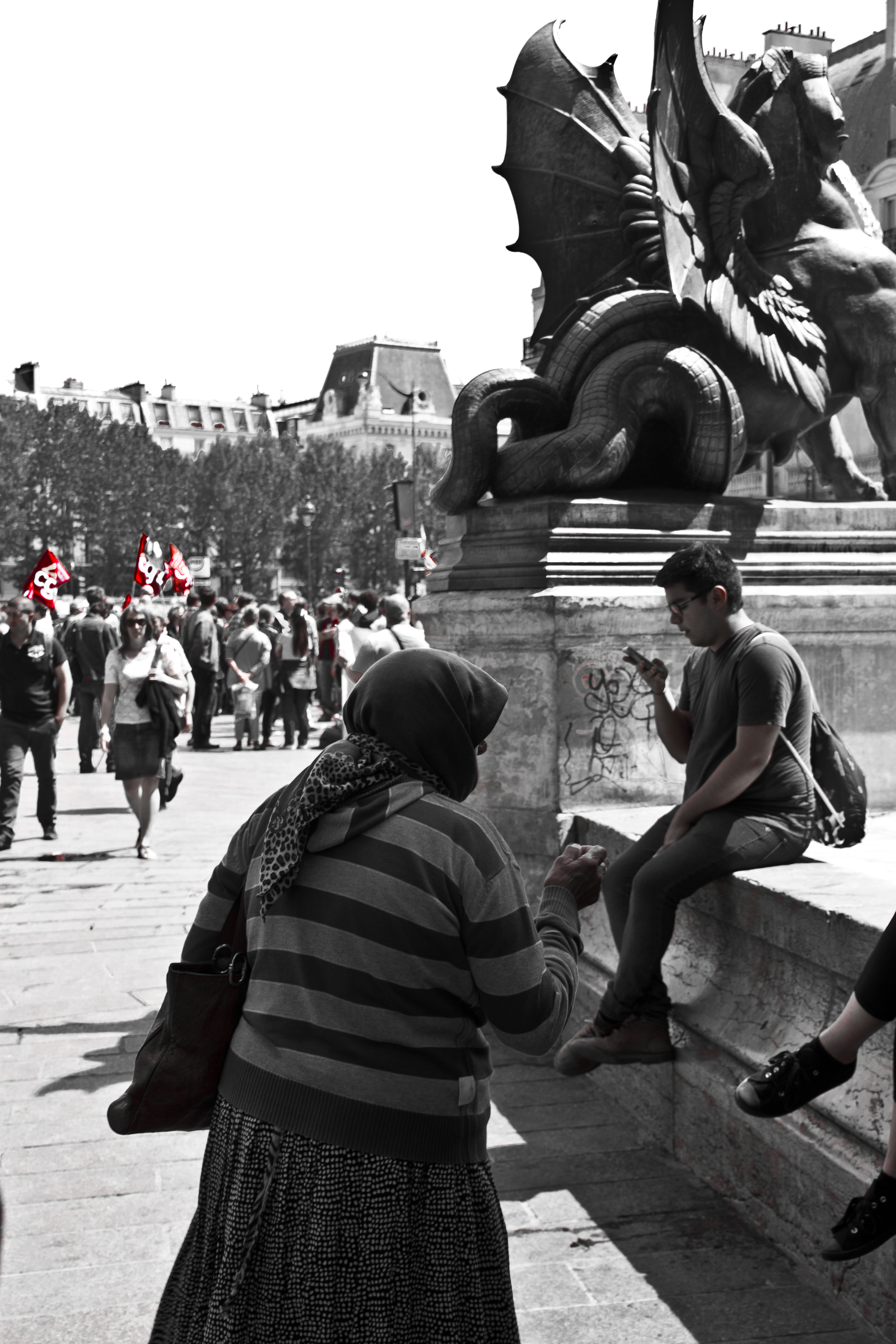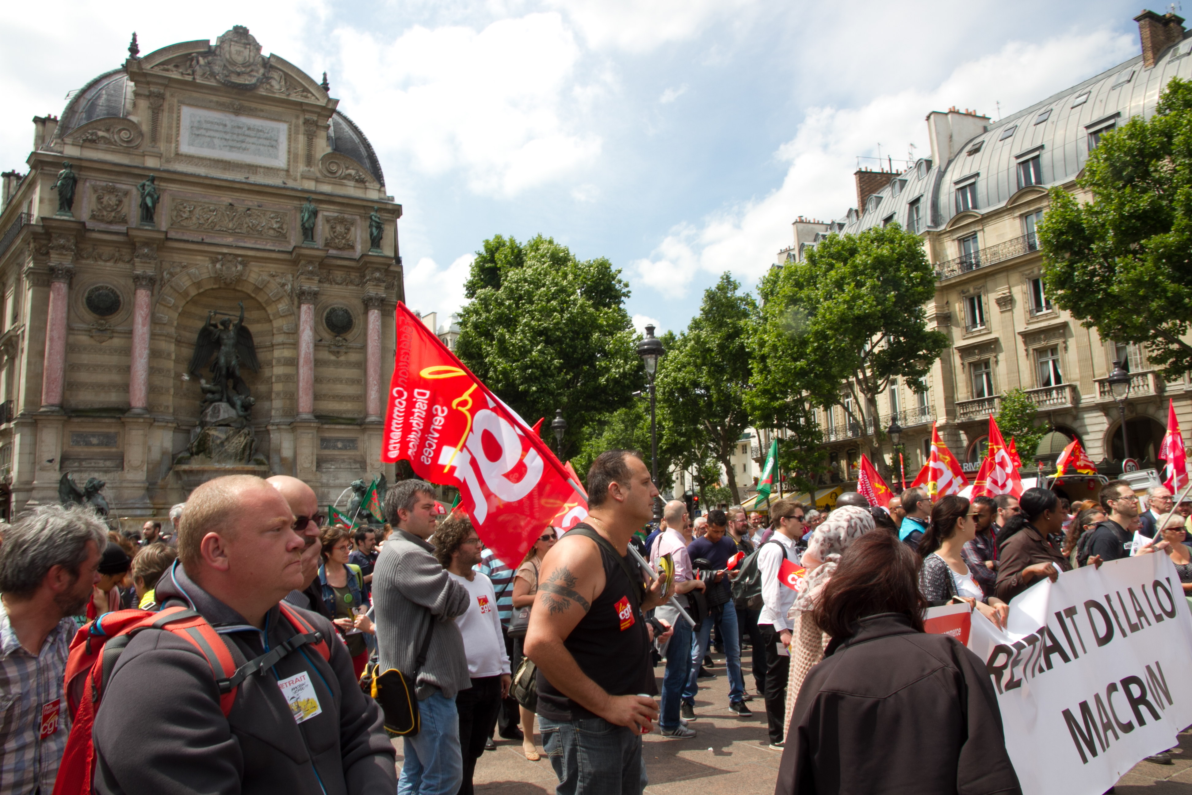C’est une belle journée ensoleillée Place Saint-Michel. « C’est un joli nom Camarade C’est un joli nom tu sais. Qui marie cerise et grenade. Aux cent fleurs du mois de mai. » chante Jean Ferrat dans la sono du camion de la CGT. Faisant suite à mon article sur la fermeture définitive de la Librairie La Hune, j’ai reçu le commentaire suivant de Rémy Frey, employé à la Librairie Gibert Joseph : « Un beau texte. Seul oubli, dans la composition du rassemblement, étaient présents des libraires (gibert joseph au moins) syndicalistes engagés dans la défense des emplois et des métiers des commerces culturels. J’en fais partie. Un peu décontenancés avec mes camarades quand à l’atmosphère de cette fin de journée. L’heure n’est pas aux enterrements mais à la mobilisation pour enrayer les fermetures de magasins. rassemblement des salariés des commerces culturels (fnac, gibert, boulinier etc) 16 juin place saint-michel, 12h. Contre la loi macron, pour nos emplois, pour nos métiers. »