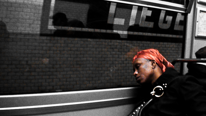 Cette dormeuse du métro Liège, la dormeuse de Liège comme je l’appelle, peut-être parce qu’elle me ramenait dans ses songes à ma ville natale en même temps qu’elle incarnait le déracinement épuisé, a été la première d’une série photographique, toujours en progrès, « La demeure des dormeurs ». J’aime ces dormeurs, dormeuses, rêveurs, rêveuses de l’espace public. Leur sommeil, leurs songes, sont à la fois leur faiblesse et leur force.