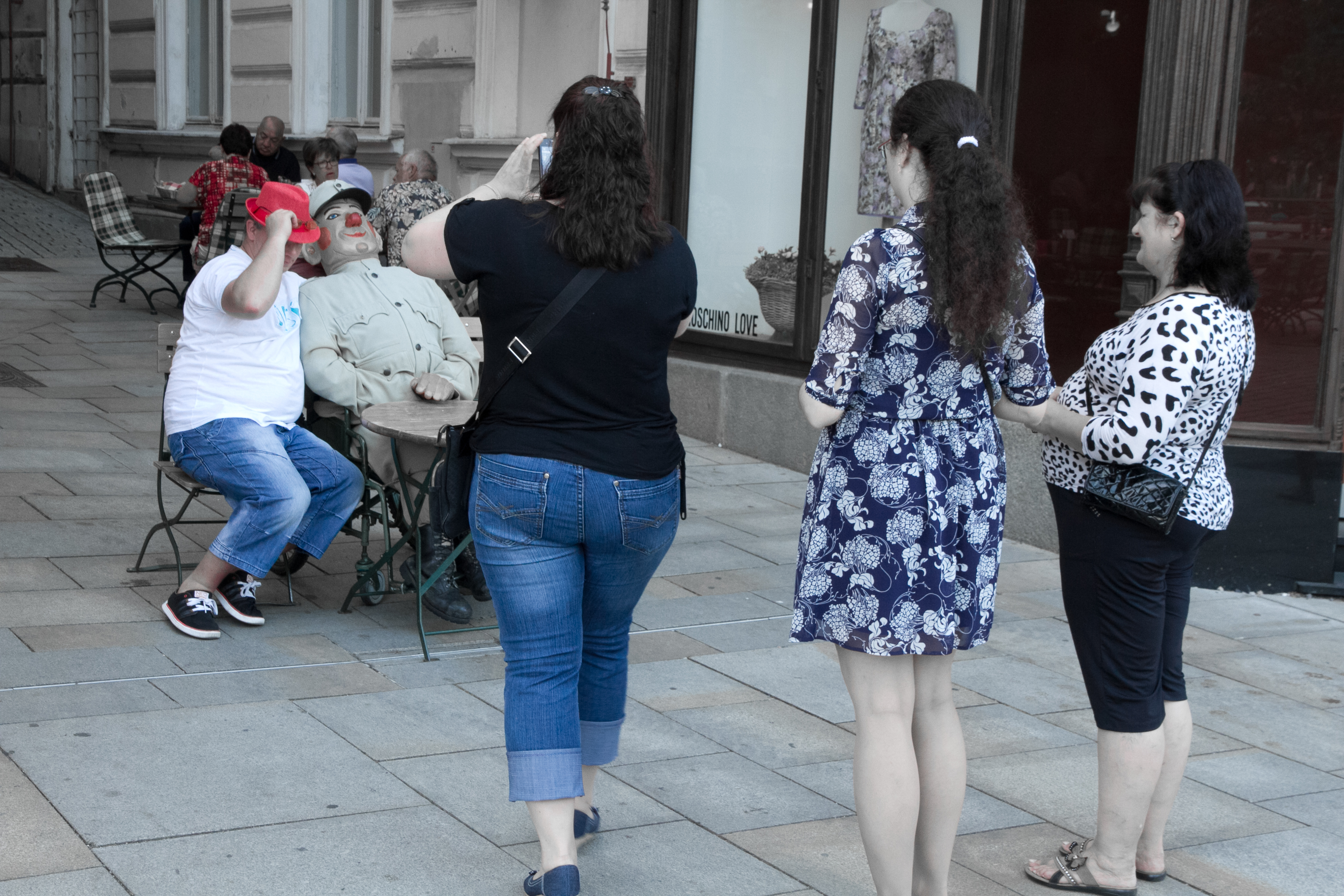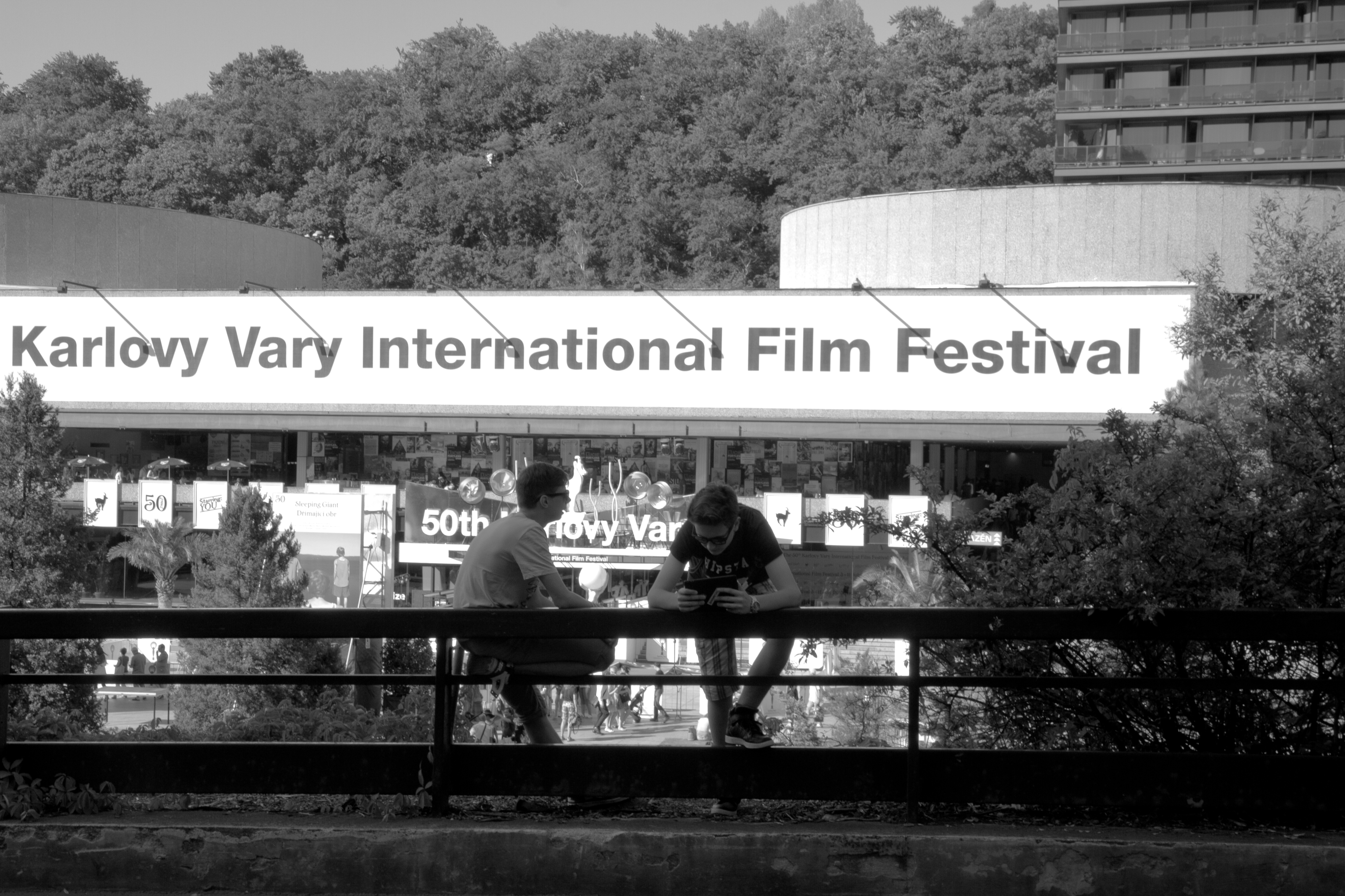 Durant le Festival international, la population sur les promenades des bords de la Replà, peut se classer en trois catégories de buveurs d’eau. Les festivaliers, petits groupes de jeunes étudiants, jolies femmes, producteurs âgés et un peu bedonnants, se reconnaissent au cordon orange de leur badge, à leur élégance aisée, sobre ou provocante. Ils bénéficient de bouteilles d’eau blanches célébrant la cinquantième édition du Festival. Les familles tchèques, qui profitent d’un long week-end, se reconnaissent à leurs bouteilles d’eau minérales vertes, achetées dans une des échoppes voisines. Ces familles sont en tenues décontractées, plutôt triviales, le cool à l’américaine est très populaire en Czech Republic. (Français, évitez « Tchéquie », dont Antonin Liehm souligna un jour la néologie absurde). Que pense la statue du Président Masaryk du T-shirt de cette maman qui proclame benoitement à ses pieds « I am Happy » ? Le bonheur, c’est donc aussi simple qu’un smiley ? Assoupi à sa table, le brave soldat Schveik, tel Fernando Pessoa au Chiado, en a marre d’être pris en photos avec d’épais commensaux qui ne savent probablement même pas qui il est. Comme à Cannes devant le Palais, le public des badauds qui ne peuvent accéder aux salles se masse autour des marches de l’horrible Thermal Hotel, le centre du Festival, en espérant voir Richard Gere, Harvey Keitel ou quelque star locale.