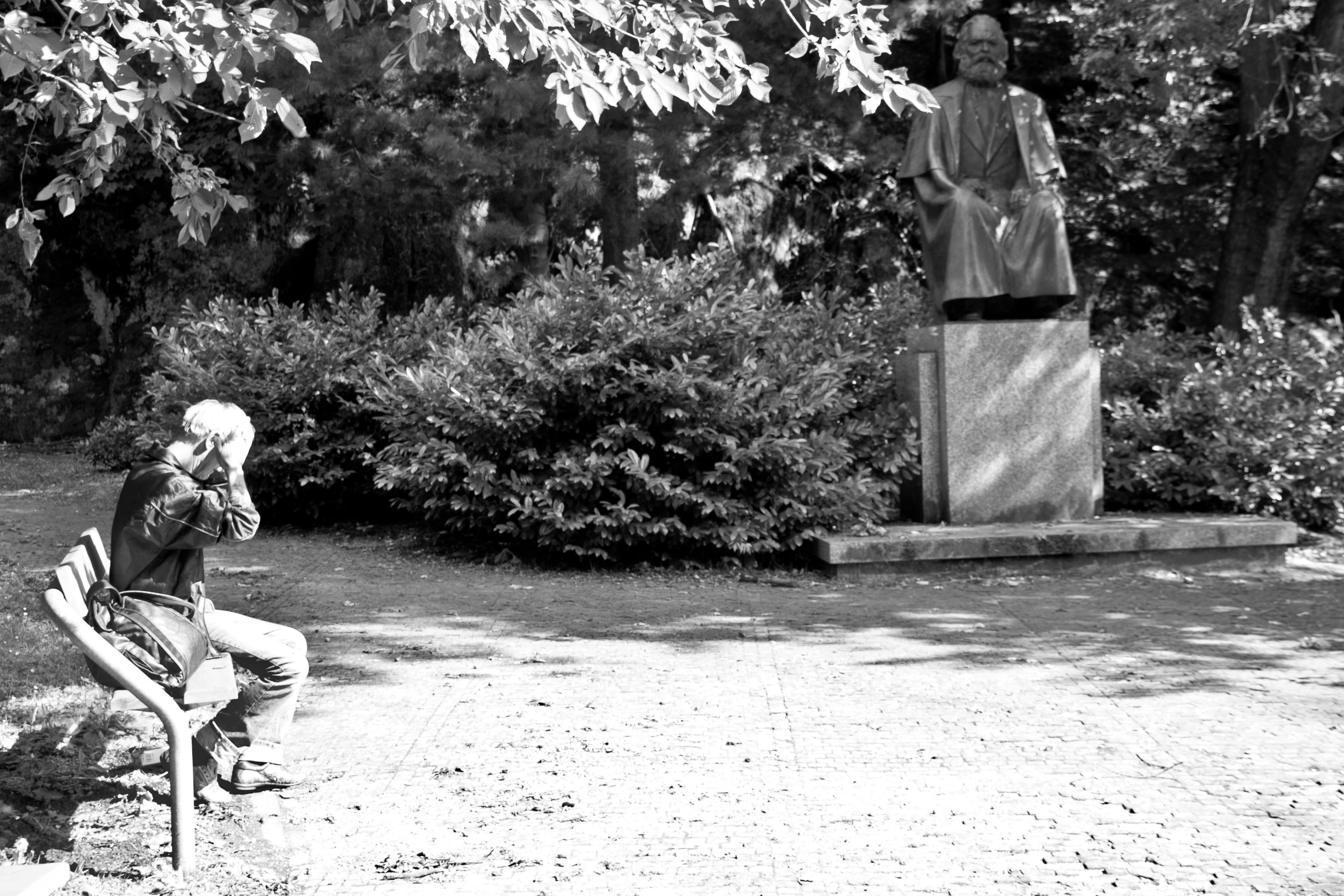 Ah oui, j’oubliais. Devant la statue de Marx, seul devant la forêt, il y avait un homme seul, désoeuvré, surveillant vaguement son chien, et qui a caché son visage fatigué lorsque je l’ai photographié. Et, tout au long de la promenade, je n’ai pas vu une seule librairie.