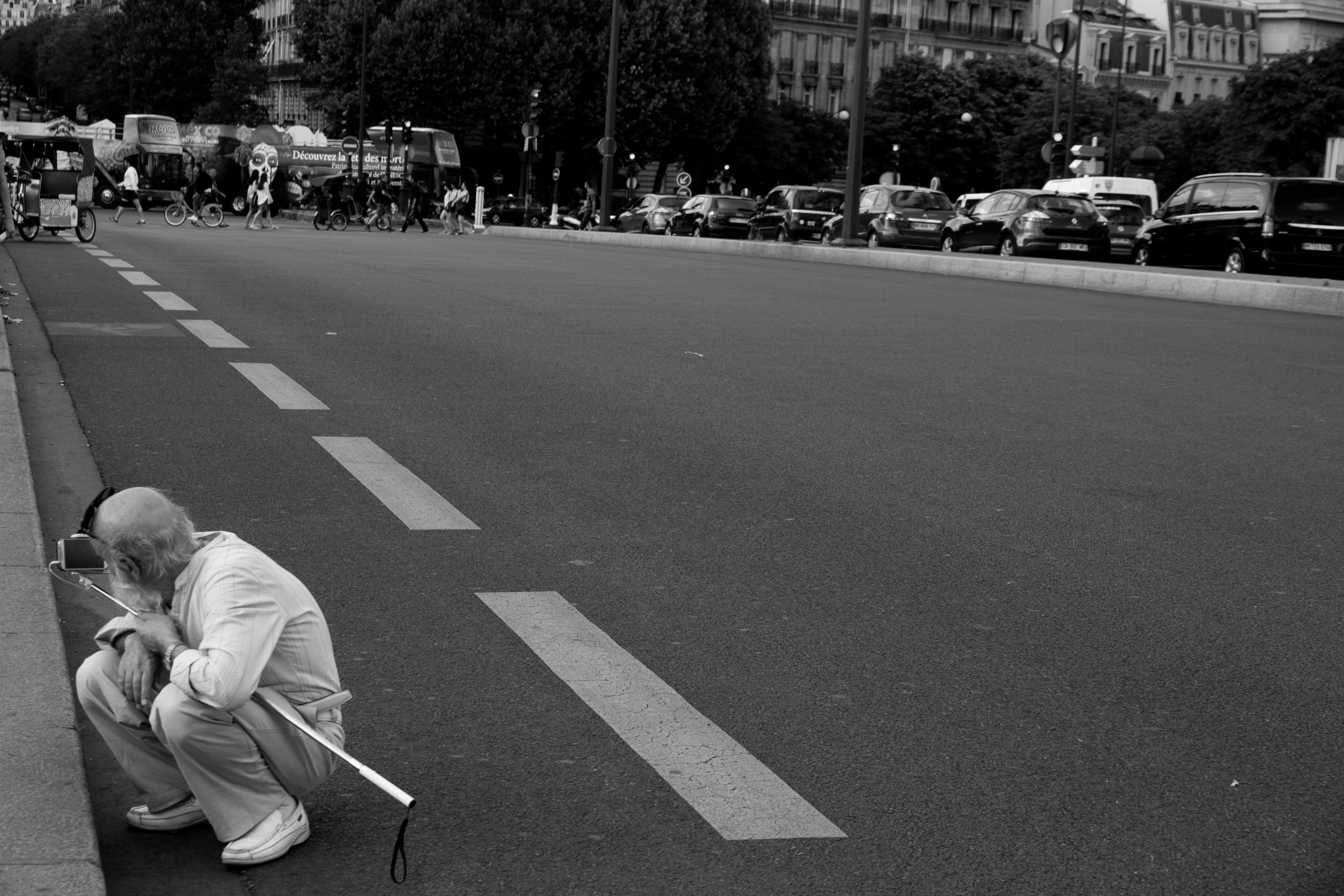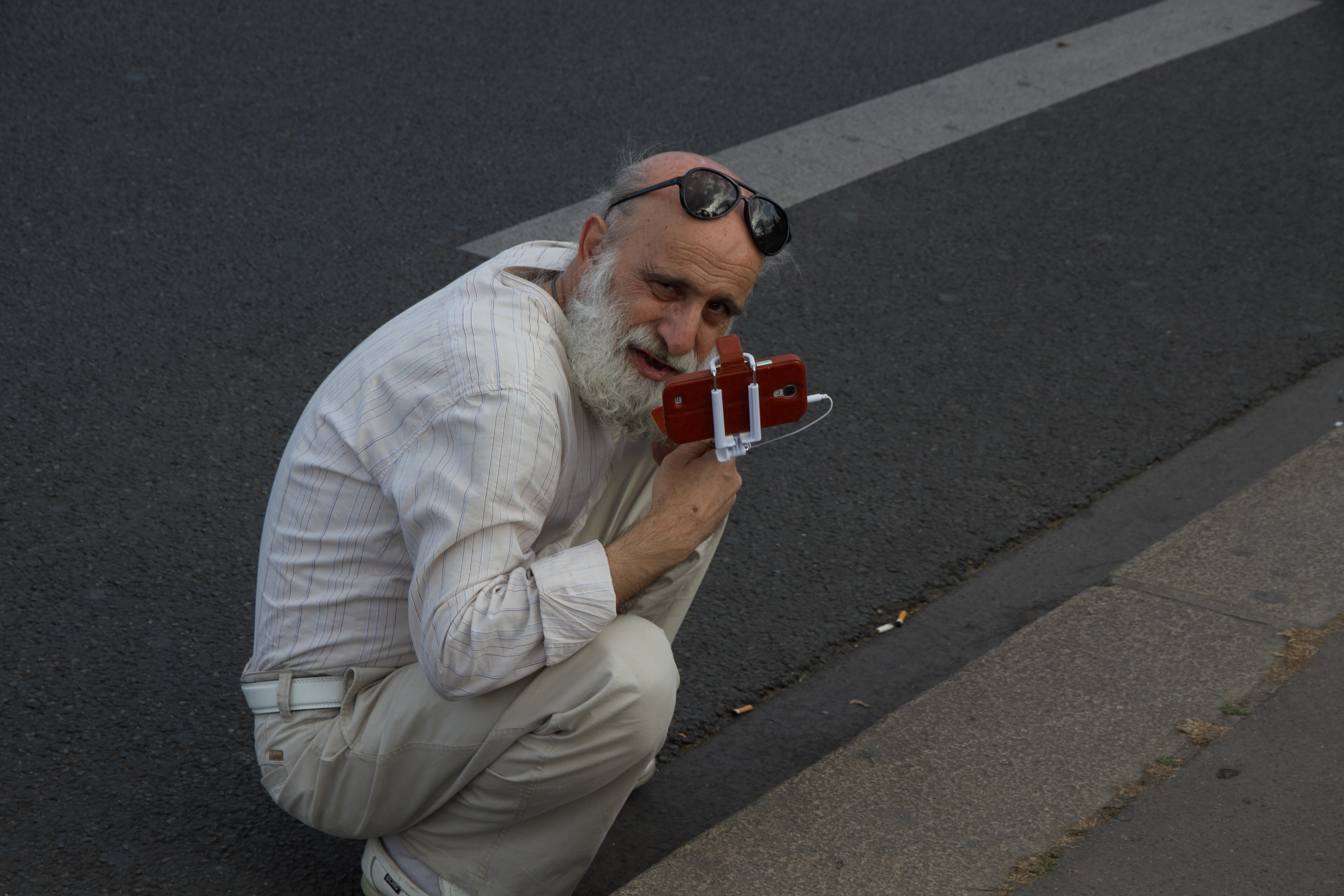 Il n’y a pas de doute : le néologisme doit être créé en son honneur. Ce 14 juillet, aux alentours de 19 heures, c’est déjà la cohue au Pont de l’Alma. Le petit peuple parisien se presse pour prendre la position stratégique qui lui permettra, dans quatre heures, de regarder les feux d’artifice qui illumineront la Tour Eiffel. Familles, odeurs de merguez, stations de métro fermées. Tout de blanc vêtu, barbe blanche de philosophe, insouciant de la foule et du flot de voitures, il est accroupi sur la file pour cyclistes, l’iphone vermillon sur sa tige. Il ne se photographie pas ; il se filme, en parlant. Sa glossolalie est couverte par les rumeurs des alentours. Je crois comprendre qu’il parle de la Grèce et des malheurs du monde. Sa performance relève du geste artistique. C’est le selfiste.