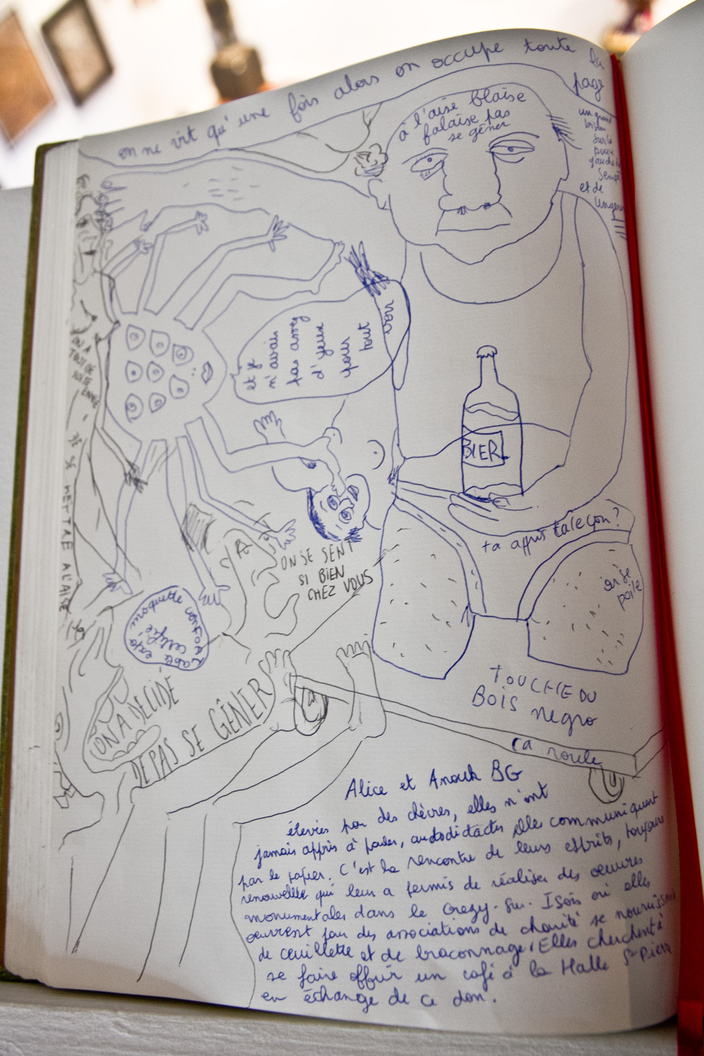 On ne peut pas photographier, c’est normal après tout. Mais je prends quand même un cliché du livre d’or, où se manifestent quelques talents inconnus. Alice et Anouk ne m’en voudront pas de contribuer un peu à leur gloire.