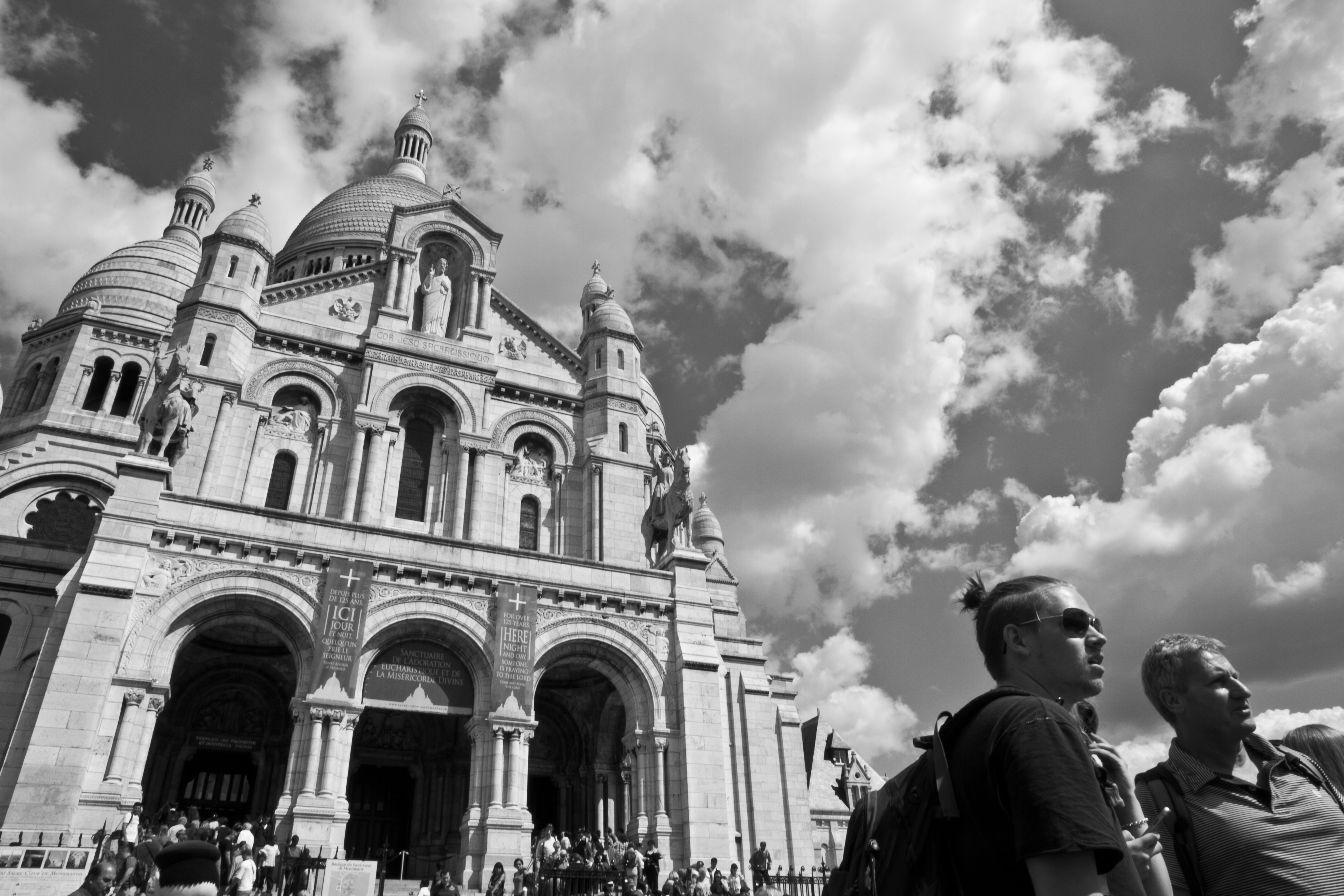 Plutôt que de reprendre immédiatement le métro, nous décidons de marcher un peu, de remonter vers Montmartre. Beau ciel d’orage, photogénique. Je hais le Sacré-Coeur, construit pour célébrer la restauration de l’ordre bourgeois, victorieux de la Commune de Paris. Les touristes ne savent pas cela, mais constituent ici un beau matos photogénique. Et tour ce qu’on leur mitonne est étonnant : petites boutiques faussement pittoresques, prédicateurs tape à l’oeil, bonshommes à photographier les enfants. Une petite entreprise à retaper de vielles 2CV et propose un itinéraire touristique. Il y en a tellement qu’on se dit que l’écurie n’est pas très loin. Les restaurants bobos sont fermés, après tout c’est les vacances, mais les traces des luttes urbaines sont visibles sur les murs.