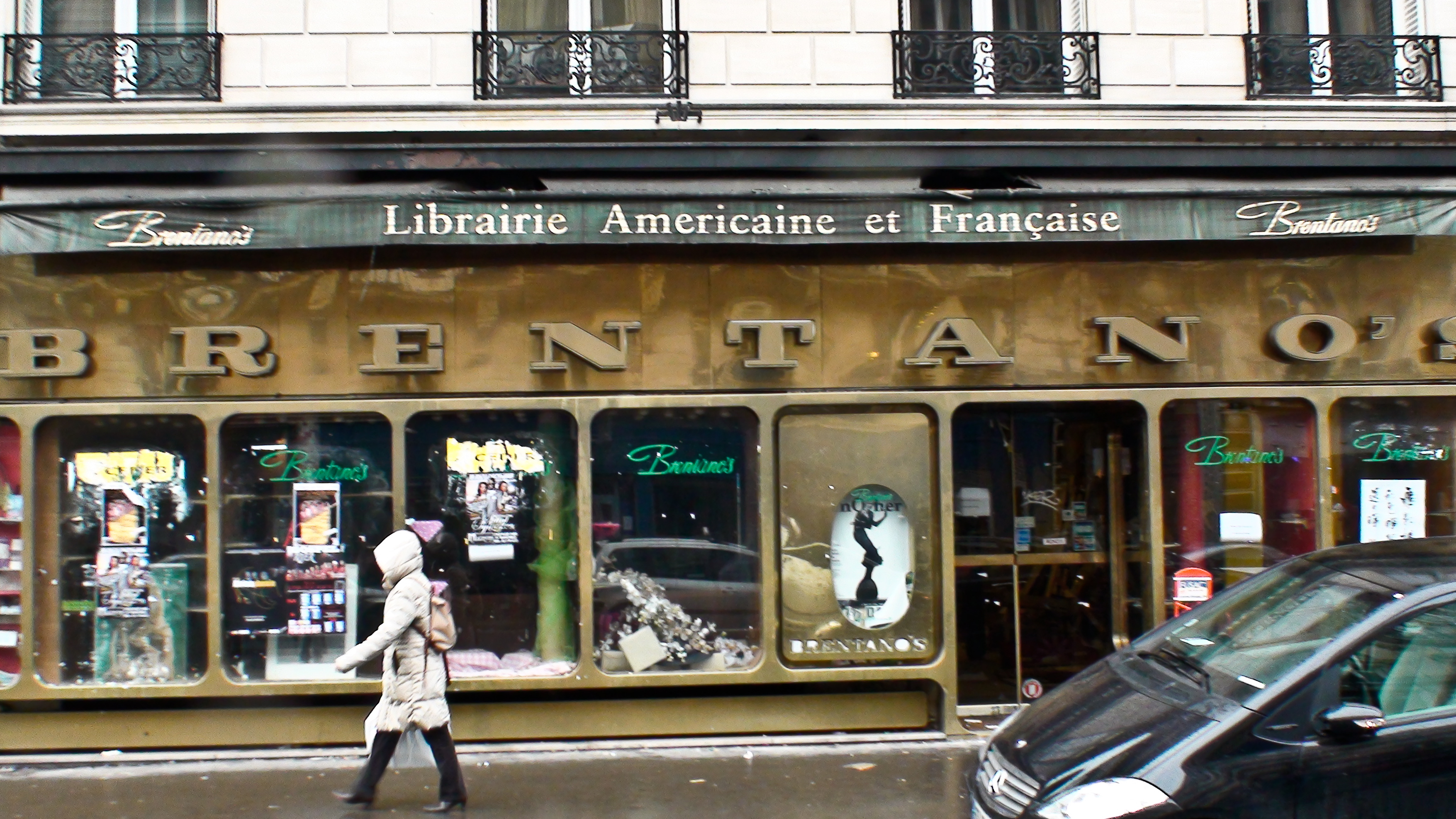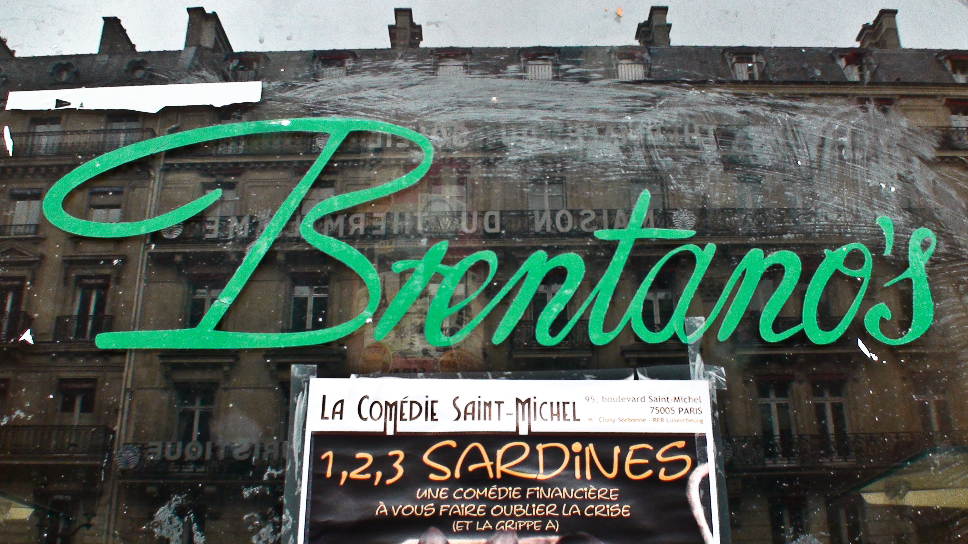 J’ai déjà d’ici, à propos de la fermeture de La Hune, la tristesse et a nostalgie, la colère aussi, suscitées par la disparition des librairies. Ces sentiments sont encore plus forts à l’égard de librairies que je n’ai pas connues, mais que des auteurs aimés, et j’aime particulièrement Valery Larbaud, évoquent avec talent. Le 24 décembre 2009, j’ai pris quelques photos de la Brentano’s, avenue de l’Opéra, et qui avait fermé quelques mois plus tôt. Un théâtre avait collé sur la vitrine une affichette pour une « comédie financière 1, 2, 3 sardines. C’était triste à pleurer. Mina, plus angliciste que moi, y allait de temps à autre.