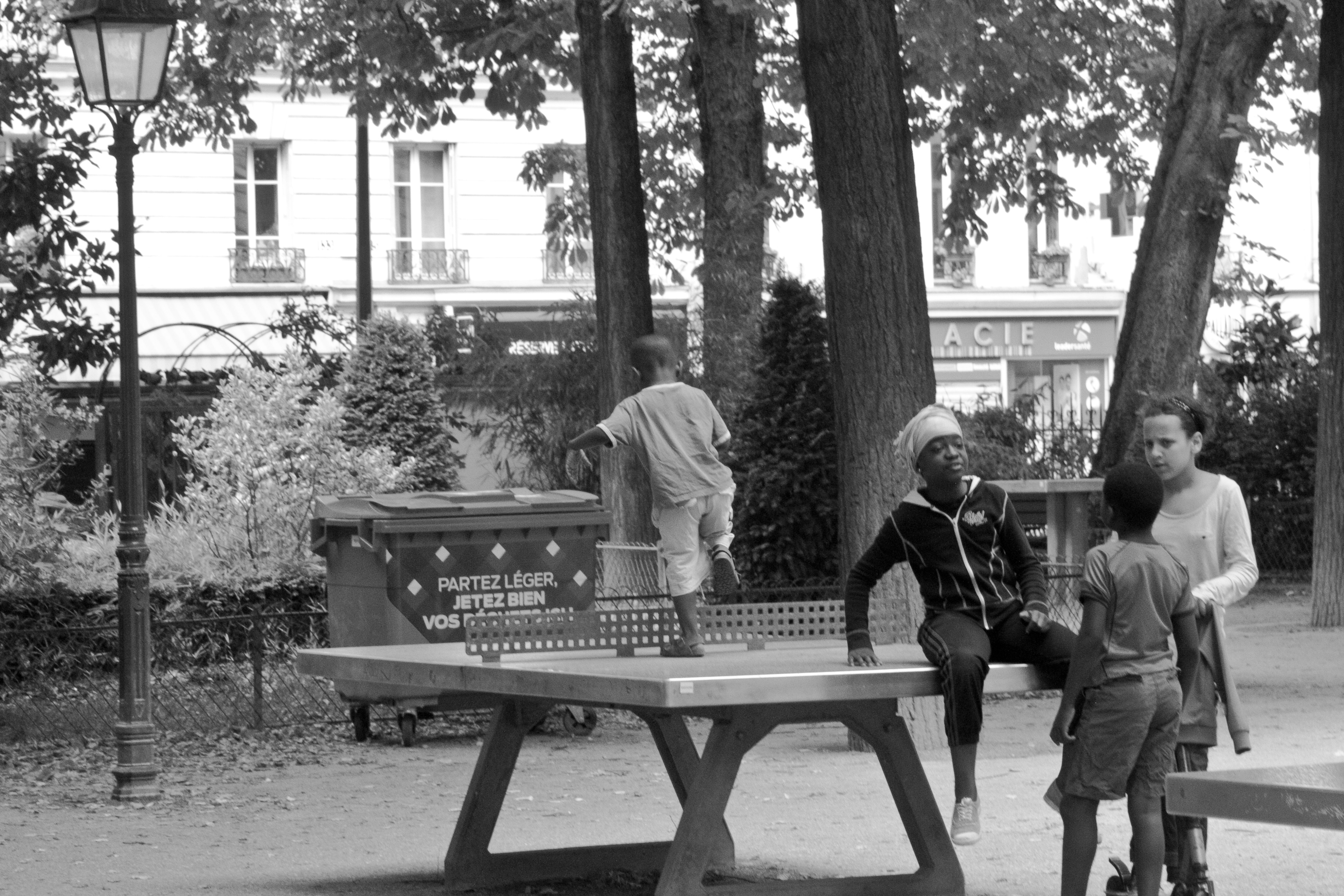 Avec Mina, nous décidons d’aller assister au tournage, annoncé pour ce 16 août, Rue Baudelaire, dans le 12ème arrondissement, juste à côté du Faubourg Saint-Antoine. Pas de chance, il n’y a personne, si ce n’est une camionnette de service, dont le chauffeur veille à clôturer l’espace dès qu’une voiture quitte son emplacement devant le numéro 32. Sous le kiosque du square Armand Trousseau, une dame joue de l’accordéon et chante des romances d’une belle voix forte. Une petite fille au joli bonnet rose voudrait l’imiter mais, la petite, l’instrument pèse trop lourd. « La musique, à partir de huit ans » dit la dame à la maman. Derrière le kiosque, un petit négrillon saute allègrement par-dessus le filet d’une table de ping-pong.