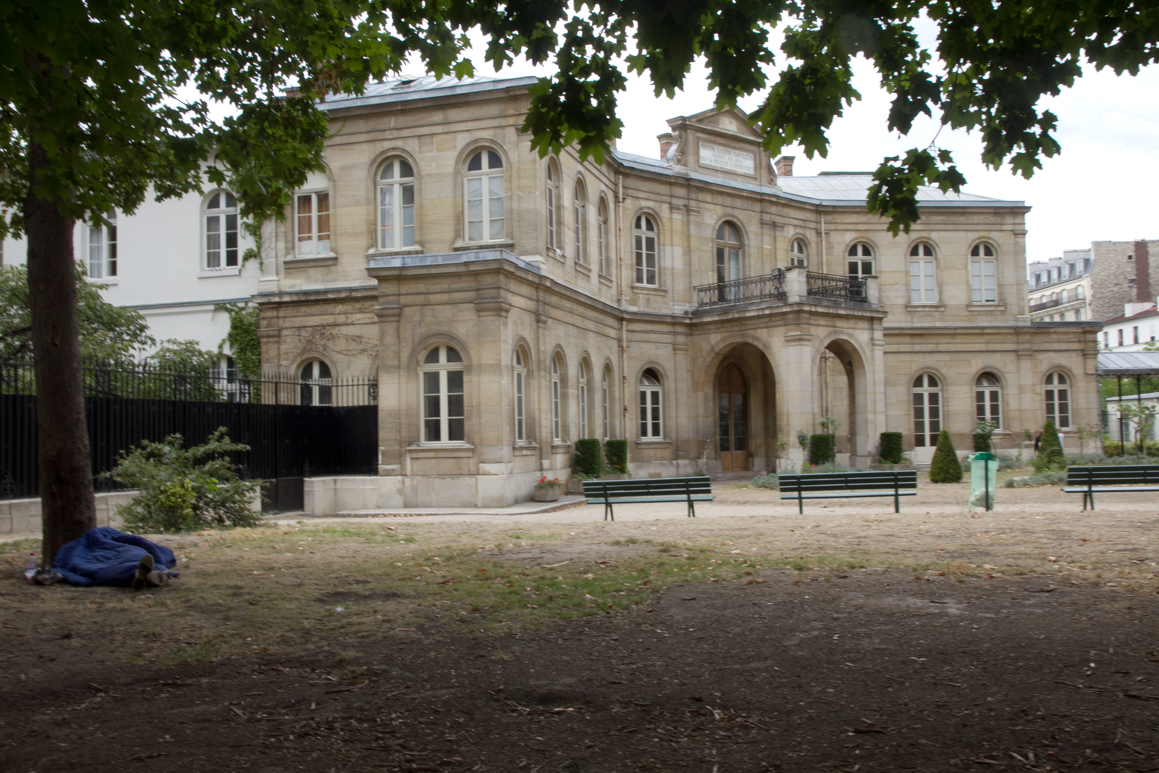 Retour vers le Faubourg. A l’angle avec la Rue Picpus se dresse d’orphelinat Eugènie-Napoléon. Hillaret, dans son inépuisable Dictionnaire historique des Rues de Paris, deux lourds volumes que malheureusement on ne peut emmener en flânerie, raconte qu’à l’occasion des fiançailles de Napoléon III avec Eugénie de Montijo, en janvier 1853, la commission municipale vota un crédit de 600 000 francs pour l’achat d’une parure destinée à orner les épaules de la future impératrice. Celle-ci récusa le don et demanda que le montant en fut affecté à une oeuvre charitable. Sur un ancien dépôt de farine qui appartenait à la ville, l’architecte Hittorf fut chargé de construire l’orphelinat Eugénie-Napoléon. Pour rappeler le collier qui était à l’origine de la construction, l’architecte dessina un bâtiment principal de façon telle que les deux branches du collier soient figurées par les ailes, son fermoir par le salon d’honneur, et son pendentif, par la chapelle. La bienfaisance impériale avait de ces brillants ! La Fondation Prince Eugène est aujourd’hui géré par les Soeurs de la Charité et le bâtiment abrite une école. Le jardin est peu entretenu, pas même entretenu. Sur la pelouse impériale, un clochard dort tranquillement dans son sac bleu. Peut-être l’avons nous réveillé. Lorsque nous quittons le jardin, il commence une glossolalie maugréante.
