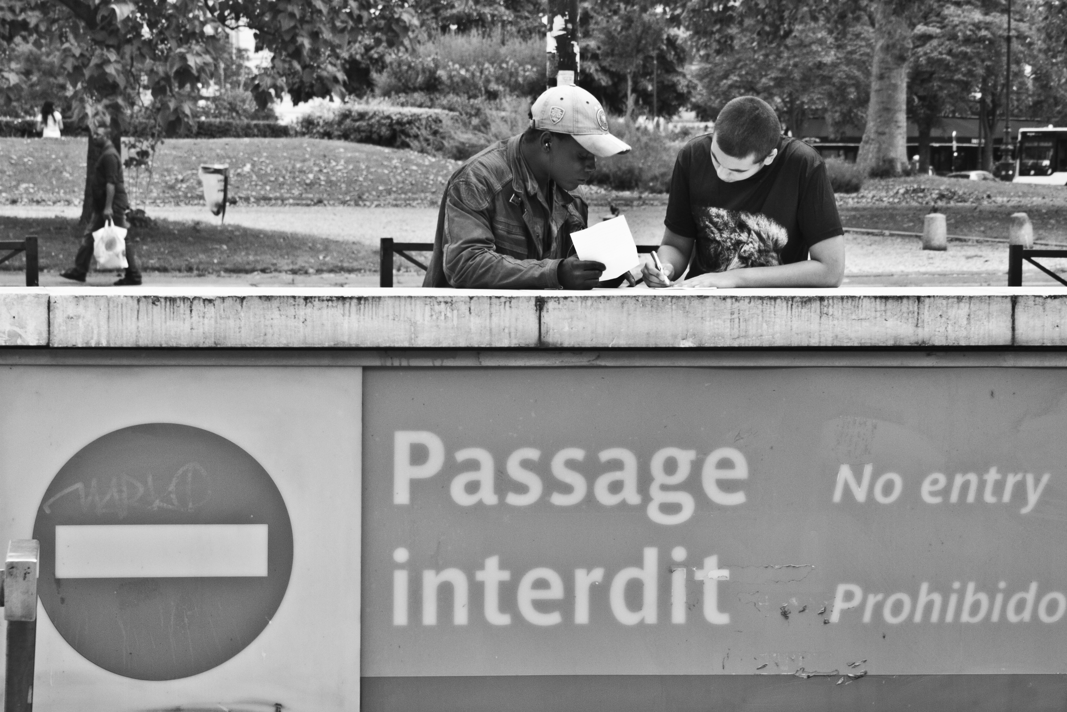Petit détour vers le marché d’Aligne Beauvau, où c’est bientôt l’heure des glaneurs. Un peu plus loin, au 246, je suis impressionné par un immeuble de style hausmannien, complètement troué sur le côté gauche. Cette ouverture donne sur le Passage du Génie (celui de la Bastille n’est pas si loin), dans lequel nous nous engouffrons. Il y a là une résidence pour travailleurs africains. La petite rue bruisse de leur palabre. Ils sont là, par petits groupes, à s’entretenir sur le trottoir. Un marchand fait griller des épis de maïs. Nous arrivons Boulevard Diderot. Un autre foyer, pour jeunes apprentis, se trouve dans un immeuble élégamment modernisé. Une vitre fait entrevoir un jardinet. Elle porte des séries d’initiales gravées, comme un hommage aux p’tis gars qui ont résidé là. Après avoir traversé la rue Picpus (quand est-ce que je vais trouver le temps de relire Les Misérables ?), nous arrivons à la Nation. Rond-point assez tranquille, ce dimanche. Sur un muret, un jeune homme aide un camarade noir à remplir des papiers. Beauté de cette solidarité en cette place symbolique.