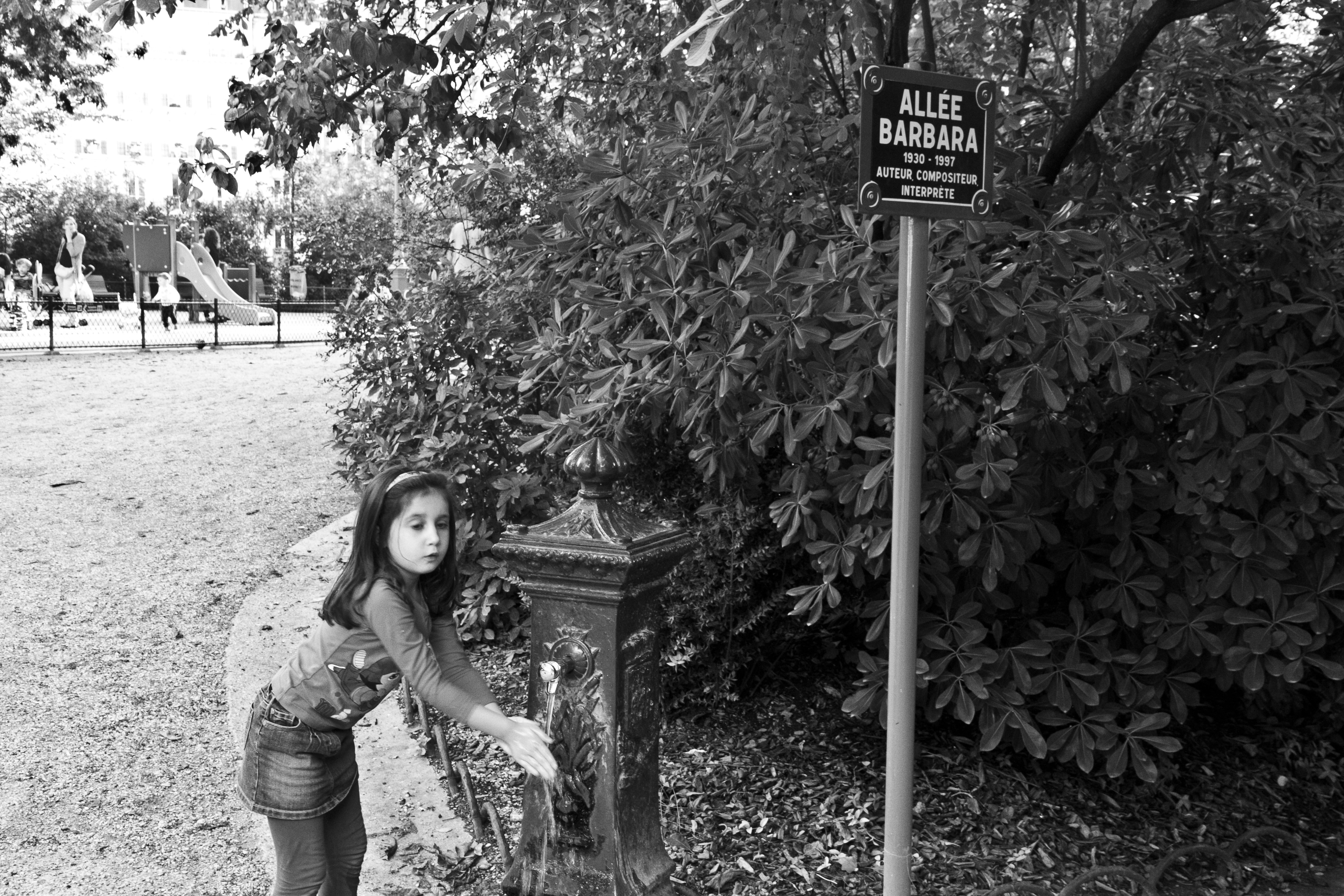 Barbara est née aux Batignolles, 6, rue Brochant, a passé son enfance au Square des Batignolles. Lorsque nous sommes arrivés, il y avait une belle lumière. Une petite fille était à la fontaine, juste à l’entrée de l’allée qui porte désormais le nom de la chanteuse. De beaux arbres, comme déjà pris par l’automne. Mina s’amusait des canards, au pied d’un bonzaï, piquant du bec à la verticale vers le fond de l’étang. Sur un banc, une dame, beaux yeux noirs, blouson de cuir noir, belle encore, avait l’air très triste et je me suis dit que peut-être c’était une amie de Barbara venue là pour penser à son amie. Nous avons regardé de jeunes enfants observant les oies du Canada, puis nous sommes allés vers cet endroit du square où l’on domine les voies du chemin de fer qui longe la rue de Rome pour aller vers la gare Saint-Lazare. La lumière était toujours très belle. C’était un moment apaisant.