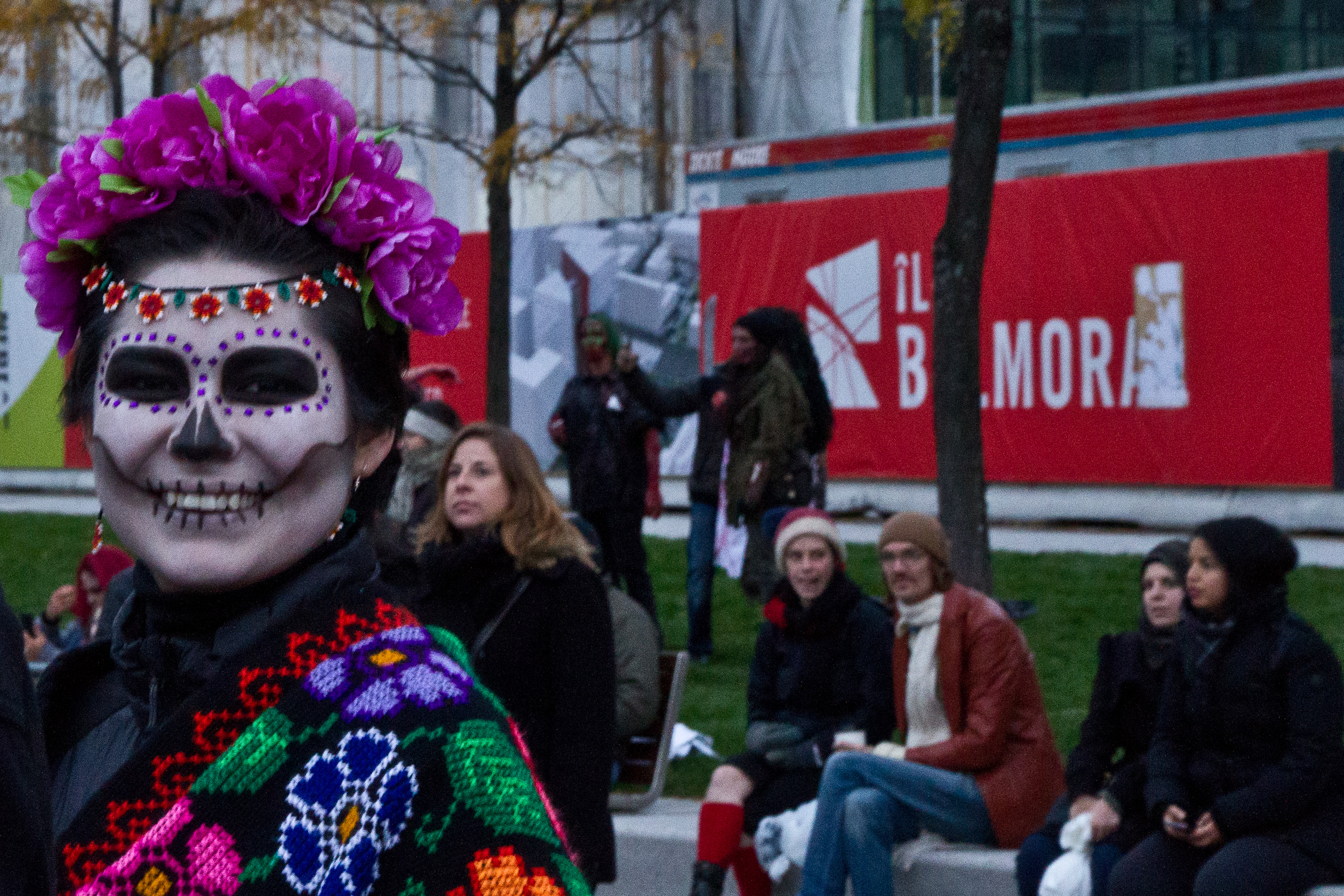 A regarder ces marches, je me dis que ce qui les caractérise, c’est un sens de la dérision, une ironie froide. Dérision zombie. Il y a du James Ensor, là-dedans. Le carnavalesque comme exorcisme de la mort, ou peut-être, plus exactement, du souvenir de la mort, du temps où la mort n’était pas une abstraction cinématographique, ni un simple mauvais moment à passer pour les familles éplorées. Il fut une époque où la mort n’était pas quelque close d’ennuyeux et de peu commercial, quelque chose qu’il ne fallait pas occulter. La culture industrialisée, divertissement faisant diversion, a effacé cette sombre évidence : « Ne chantez pas la mort », chantait Léo Ferré, finalement très pascalien dans sa critique du show business. Ce n’est donc pas la mort qui serait exorcisée par les zombistes, mais la mort de la mort. Bien que concomitantes avec Halloween, les marches zombies en seraient la critique plus ou moins explicite. Halloween, happé à la fin du siècle dernier par la machine commerciale, a perdu de son sens de fête des morts. Dans sa version américaine, elle a empesté la culture occidentale, au point qu’un service culturel britannique vient très officiellement de rappeler que les Celtes utilisaient, pour la fête de Samain, des navets et non des citrouilles. La fête des morts, comme Noël, est morte, définitivement réifiée dans des symboles vidés de leurs angoisses originelles. La marche des zombies lui rend vie. Et ceci non sans quelque syncrétisme désinvolte, puisque l’univers Walking Dead se voit contaminé par des figures d’autres espaces culturels : pirates des Caraïbes, Joker à la Tim Burton, pseudo-Frankenstein et je repère même une jolie Frida Kahlo en éclatante calavera. J’ai même vu un petit diable portant fourche auprès de sa mère, musulmane en foulard. « Je n’ai jamais été aussi bien mort » crie avec joie, sur l’estrade, le chanteur des Breastfeeders. Par son goût du non-sens, le zombisme se démarque de la récupération commerciale de la tradition celte, essaye de retrouver le goût et la saveur de la fête. Pour combien de temps ?
