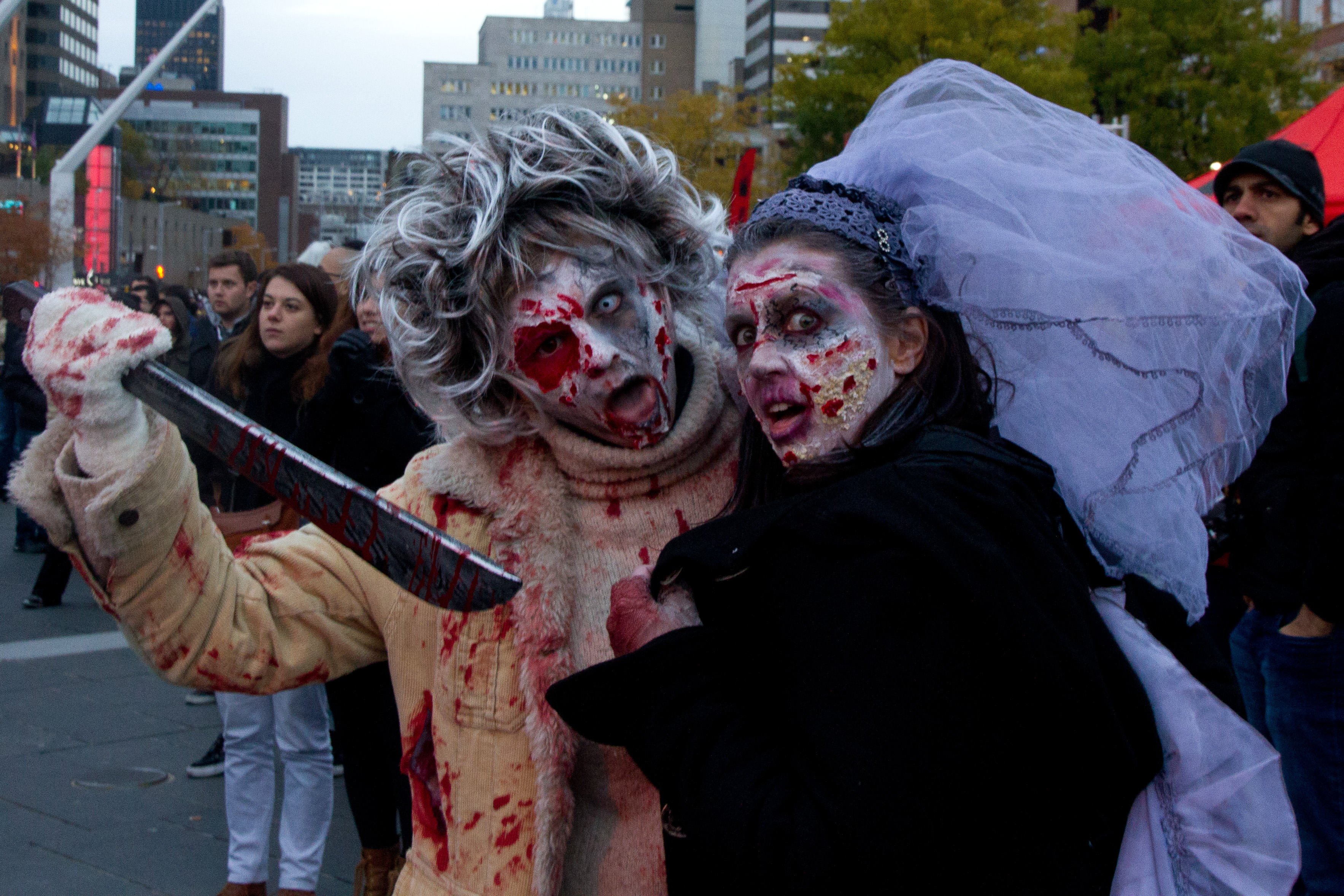Les marches de zombies, c’est aussi du pipeau, sanguinolent et purulent à souhait Des trucs sponsorisés par les festivals de cinéma fantastique ou par le câblodistributeur local. C’est du rigolo. Les trucs pour rendre spectaculaires vos plaies béantes vous sont données sur le site web des organisateurs. « Tout d’abord il faut travailler sur une peau propre et sèche afin que les produits adhèrent bien. Plusieurs articles que vous possédez à la maison peuvent vous servir pour créer de beaux effets, tels que le papier hygiénique et les flocons d’avoine crus! Commencez avec les plaies et textures de peau, il vous sera plus facile d’ajouter le sang et les couleurs par la suite. Choisissez un ou plusieurs endroits du visage où vous voulez changer la texture ou créer une plaie. Appliquez une mince couche de latex liquide Mehron couleur peau. Déchirez de petits morceaux de papier hygiénique. Prenez un morceau de papier environ de la même taille que le latex appliqué et déposez-le sur le latex. L’application n’a pas besoin d’être parfaite et lisse, au contraire! Une peau au « look » abîmée fera un meilleur effet! Ajoutez du latex par dessus le morceau de papier et laissez-le sécher. Vous pouvez répétez une deuxième fois afin d’obtenir une peau plus ou moins épaisse ou laisser tel quel. Le but est de créer diverses textures. »