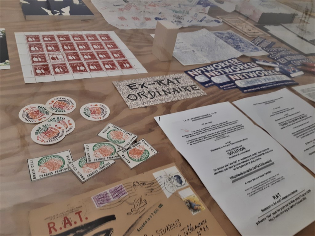 Une citation de Charles est affichée sur le seul panneau explicatif de l’exposition : l’importance n’est pas l’oeuvre mais la liste des membres du réseau. Je me souviens que, dans les années 80, Charles, installé à sa « permanence sociale », la terrasse du Bouquin, me racontait sa participation à des projets collectifs, citait avec respect le nom de correspondants, dont je comprenais qu’ils étaient des « têtes de réseaux ». Charles participait à des rencontres internationales et il me revient qu’il s’est même déchiré le ménisque interne du genou droit lors d’un vernissage au Musée de la Poste à Paris en 1993 et qu’il était venu se réfugier chez Mina avant de regagner Liège le lendemain.