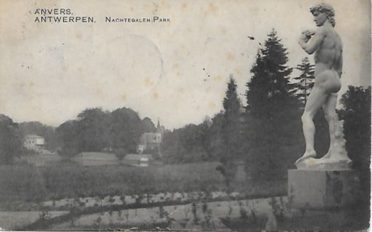 La mention « Vieux.trou-de-balle » adressée à une citoyenne de l’ancienne commune d’Ougrée, Mademoiselle Claire Lefranc, que je n’ai pu identifier, donne tout son sel à cette carte postale postée dans la ville d’Anvers / Antwerpen, aujourd’hui fief d’un homme politique dont la destruction de la Belgique est le rêve explicite. Si je puis me permettre un mauvais jeu de mot, le verso a ici plus d’intérêt que le recto. Le propos est clairement amphigourique, l’expression « vieux.trou-de-balle » pouvant aussi bien désigner le postérieur de la copie du David de Michel Ange photographiée dans le Nachtgalen Park qu’être une insulte directe à l’attention de la destinataire. Vous me direz qu’il s’agit là d’une simple grivoiserie et qu’il est difficile d’y voir une forme artistique. Mais Pascal Durand, dans l’entretien précité rappelle que Marcel Duchamp adressa un jour à l’organisateur new-yorkais d’une grande exposition un télégramme postale portant la mention « Peau de balle » : « pur message et pur pied de nez adressés à l’institution artistique » commente Pascal. Information un peu approximative, ce à quoi il ne nous a pas habitués . En réalité il s’agit d’un télégramme envoyé de New York par Western Union à son beau-frère Jean Croti, en réponse à une invitation qui lui avait été adressée par les Dadaistes parisiens (lesquels contesteraient sans aucun doute le statut d' »institution artistique ») de participer au Salon Dada à la Galerie Montaigne. Et le texte était « PODEBAL » (2). Mais peu importe ce détail. Plus intéressant est la convergence avec la photo, reprise dans le livre pré-cité de Charles François sur Alain D’Hooghe où l’on voit le jeune Jacques Charlier tenir, avec une sorte de dégoût ou de mépris, un panneau préparé par le dit Alain, avec la mention « Les bons artistes mettent toujours le doigt dans leur trou-de-balle ». Cette convergence de propos entre Marcel Duchamp, Alain D’Hooghe, Jacques Charlier, Charles François et Pascal Durand, m’autorise à suggérer, moi qui ne suis qu’un cul-terreux de l’histoire de l’art, que la carte postale envoyée par un inconnu à une jeune mademoiselle d’Ougrée, ville natale d’Albert Mockel, de Jacques Lizène et de moi-même, est bien en fait l’acte fondateur du mouvement du Mail Art wallon, caractérisé par son impertinence, son érudition post-dadaïste et son sens de la dérision.