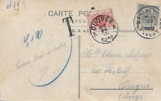 Il se fait que j’ai récemment retrouvé dans mes collections une curieuse carte postale dont j’ai signalé l’existence à Charles François, dans un petit texte à lui envoyé (en pièce jointe d’un courriel) le 8 octobre 2019, et que j’avais intitulé « Ceci est-il de l’art postal wallon ? ». La carte a été postée à Anvers le 23 mars 1912 et surtaxée le 6-7 avril ( ?) 1912 à Ougrée, ma commune de naissance. Je ne connais pas la destinataire, Mademoiselle Claire Lefranc, rue de Tilf à Ougrée, qui n’est pas une personne de ma famille et que de rapides recherches sur Google et Geneanet ne m’ont pas permis d’identifier. La signature du poète auteur de cette carte est illisible.