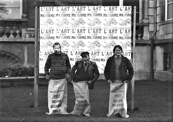 Je fus témoin d’une de ces rencontres et j’ai conservé la photographie, que j’ai prise le 20 septembre 1986 au Parc de la Boverie, face au Musée d’art moderne, haut lieu des avant-gardes et autres conservatismes liégeois. Je puis témoigner avoir vu Charles et deux de ses compères américains, les frères Barbot, sautant dans des sacs postaux autour d’un panneau sur lequel venait d’être placardés des affiches du R.A.T., ceci au grand amusement de la Dott. Germana Silingardi, qui représentait à Liège l’école sémiologique d’Umberto Eco. Ce curieux manège s’était terminé par la photographie d’un couple de jeunes mariés, dont la jeune épousée avait accepté de poser devant le panneau, affublée du masque de cochon apporté par l’un des artistes.
