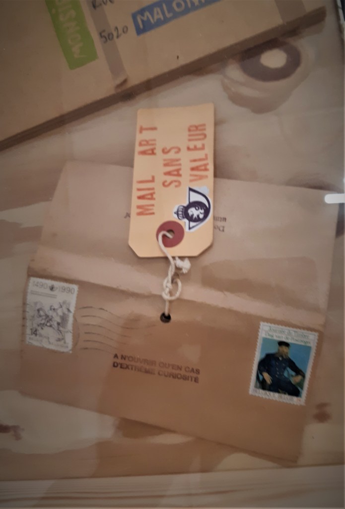 Certaines pièces sont de véritables provocations à la distribution postale, telle cette bouillotte rose envoyée par Guy Stuckens et bien arrivée à destination. Bernard Boigelot joue lui la dérision en s’envoyant une lettre accompagnée d’une étiquette « Mail Art sans valeur ». Le timbre est un des facteurs de Van Gogh et porte un cachet « A n’ouvrir qu’en cas d’extrême curiosité ».