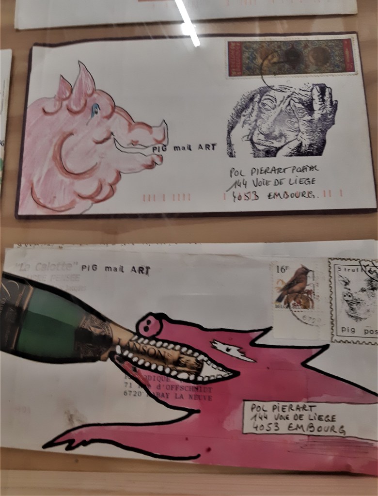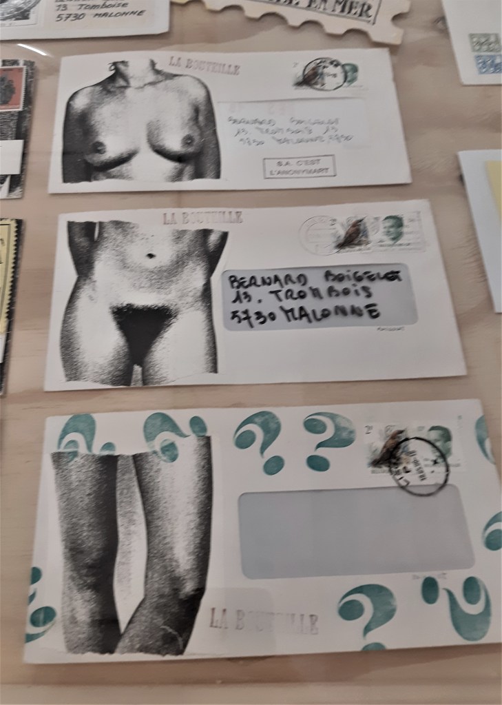 Il m’est difficile de dire si les six artistes présentés à l’exposition correspondent bien à ces trois critères énoncés par Pascal Durand. Je sais que mon ami Charles François aime bien théoriser, et que Jacques Charlier, le « pirate de l’art », aime parodier mais aussi valoriser son réseau international d’amitiés artistiques. Les autres, Eric Adam, Bernard Boigelot, Guy Stuckens, Baudhuin Simon, je ne les connais pas assez. De ce point de vue, l’exposition est un peu déconcertante. De nombreuses pièces sont disposées dans six grandes tables vitrées et l’on a parfois un peu de peine à s’y retrouver dans ce qu’il faut bien appeler des fatras d’oeuvres et de documents. Sans réelle mise en contexte, beaucoup de pièces restent mystérieuses et la particularité de la démarche propre de chacun des artistes reste difficile à percevoir, d’autant que les vitrines mêlent oeuvres envoyées et oeuvres reçues d’autres artistes. Le regard reste dès lors accroché à quelques enveloppes plus séduisantes que les autres. Ainsi j’aime beaucoup le nu découpé en trois morceaux de Bernard Boigelot auquel répondent les cochons un peu canailles de Baudhuin Simon adressés à Pol Pirard,