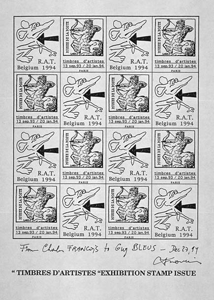 C’est quelques années plus tard que Charles va adopter la pratique plus conceptualisée de Mail Art Networking (MAN). Je me souviens du sigle R.A.T. , que Charles créa en 1982 et dont je n’ai jamais su si il signifiait Rassemblement des Artistes Travailleurs ou Réseau Art et Télécommunications. Le logo du R.A.T. était un petit rat courant, dont Charles ne put jamais réaliser l’immense réplique en peinture murale pourtant sélectionnée au concours d’art urbain de la Ville de Liège (1984) pour orner un mur de l’Avenue de l’Automobile.