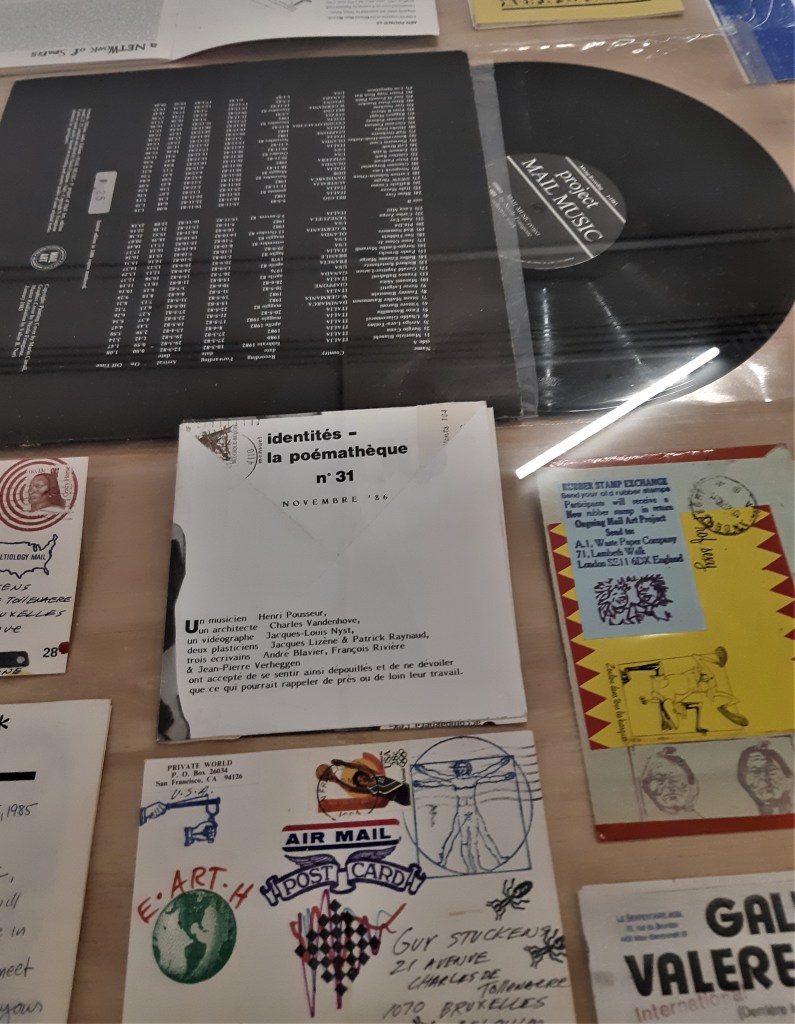 Il est dommage que l’exposition ne rende pas, ou peu compte de l’activité présentielle, souvent ludique qui accompagnait la pratique distante du mailing (comme il est dommage que j’aie égaré le « collage documentaire » fait avec nos tickets de consommations aux Caves du Longdoz, un café de Liège où, le soir du 25 décembre 1989, nous assistâmes en direct à l’exécution du couple Ceaucescu, tickets de caisse que Charles accompagna d’annotations qui, si je comprends bien, auraient maintenant une valeur muséale, puisque Charles m’avait ultérieurement fait parvenir ce « collage » par la poste).