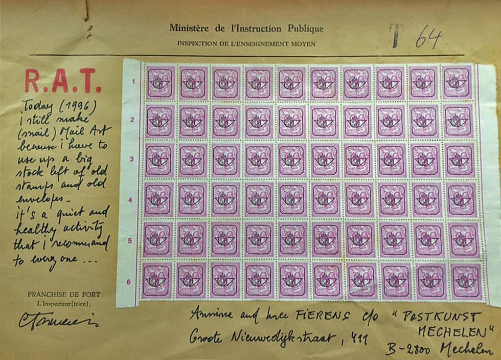 Lorsqu’en 1986 j’allai m’installer pour un an et demi à Manchester, ville qui m’était complètement étrangère, Charles me mit en contact avec Keith Bates, un des principaux artistes britanniques. Tous les vendredis soir, je rejoignais Keith et ses amis dans un pub de Disbury, et la lager tiède se descendait ferme et je ne comprenais pas grand chose aux blagues racontées avec l’accent mancunian. Keith me grava un cachet ED (pour European Dragonfly). Malheureusement, mes occupations d’alors me laissaient peu de temps pour cet aimable divertissement artistique qu’est le mail art. Plutôt que de les utiliser moi-même je cédai à Charles un imposant stock d’enveloppes administratives de l’ancien Ministère de l’Instruction publique, trouvées dans une des bibliothèques de mon grand-père. Il en fit bon usage et je n’ai utilisé la tampon European Dragonfly qu’une seule fois, dans un rare envoi adressé à Charles. Je me considère donc comme un mail artist wallon raté (c’est à dire disciple non assumé du R.A.T.).
