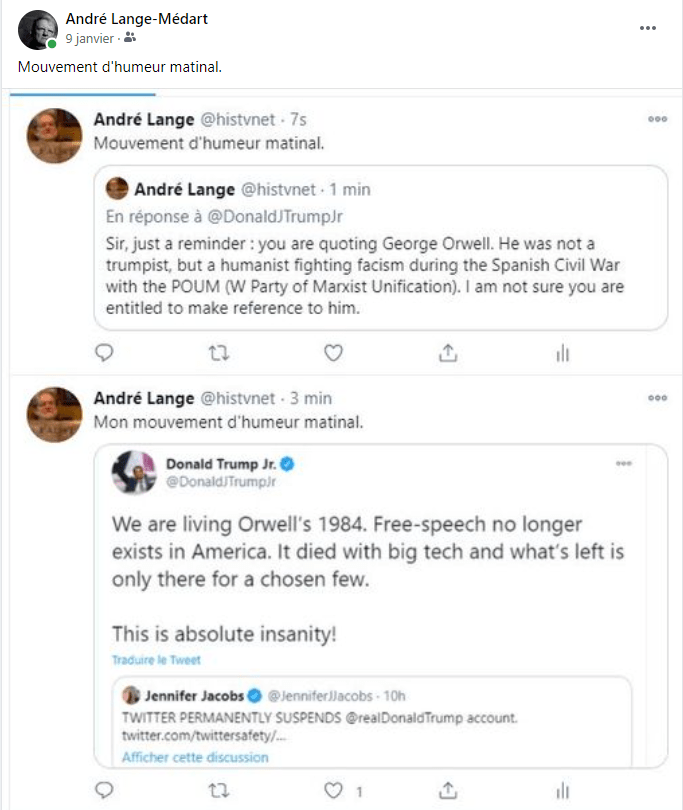 Je suis en train de préparer un article sur Edouard Husson. C’est le seul enseignant universitaire trumpiste proclamé que j’ai identifié en France. J’ai lu son livre sur l’historiographie du nazisme. Il critique les heidegerriens et Nolte. C’est aussi quelqu’un qui vient du giscardisme pro-européen. En remontant le fil de ses tweets son basculement commence en 2015 avec le constat de l’arrogance allemande durant la crise grecque. Il vire au souverainisme et se réjouit de l’élection de Trump dès 2016. Il crache sur Merkel et fait l’éloge de Poutine. Il se revendique de Burke et de l’analyse du « liberal fascism » de Jonah Goldberg (qui voit dans la Révolution française le début du fascisme). Pour ce qui est de ses analyses de la période post-électorale aux Etats-Unis, il a repris la thèse du coup d’Etat démocrate, sinon gauchiste, avancée par Guy Millière dans Dreuz-Info (la source qu’il recommande !). Ce qui est vraiment grave, c’est sa déformation des chiffres, des textes légaux et des faits. Il suit Giuliani sur toute la ligne. Et quand on lui cite les 64 procès perdus, il répond ‘Ainsi vous feriez confiance aux juges de procès de Moscou ? ». Sur Twitter, le Comité Trump France a laissé tous les trolls anti-Trump s’exprimer. Husson, lui, bloque systématiquement tous ses contradicteurs. Il promet un livre dans 18 mois…