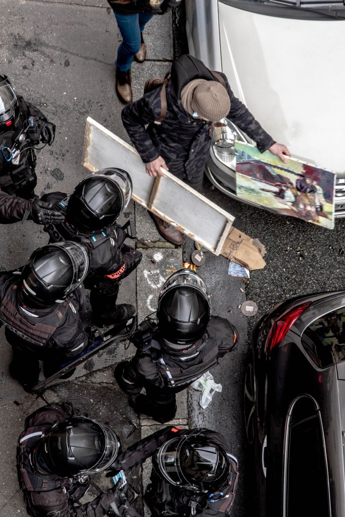 Une manifestation défile sur l’Avenue. En même temps se tient une brocante. Sous ma fenêtre, rencontre d’un amateur d’art et d’une brigade de police. Reportage domestique ici.