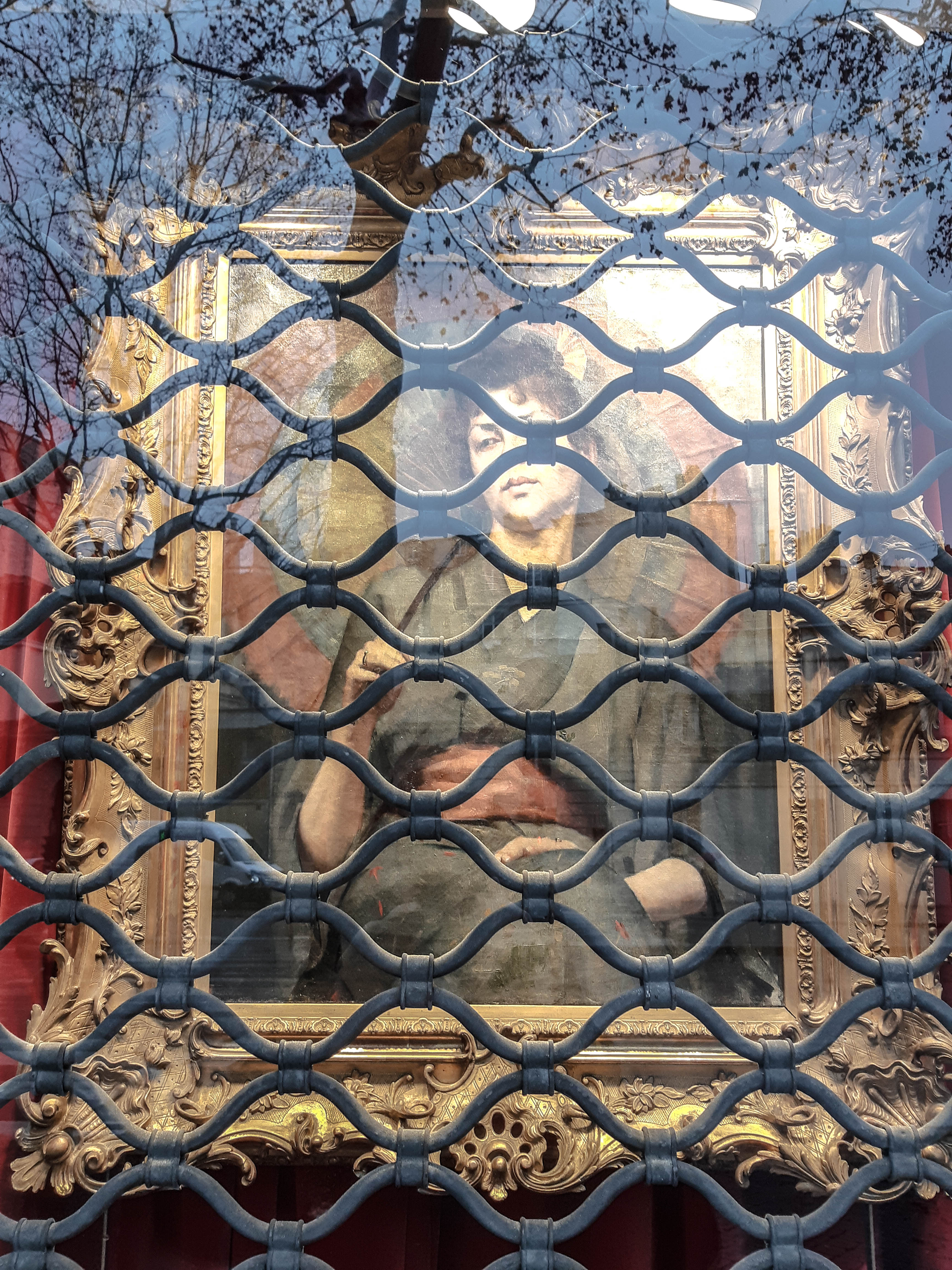 Rare sortie parisienne ce matin. Pour pures raisons administratives. Rapide promenade sur le Boulevard Saint-Germain. Cette photographie d’un portrait de femme, enferémée derrière le volet grillagé d’une vitrine d’antiquaire, est une métaphore de la période.