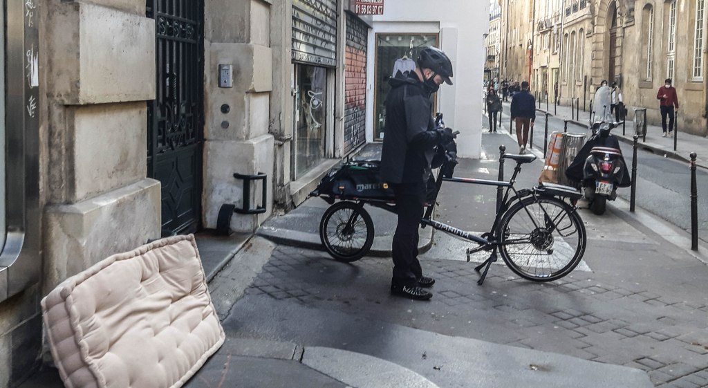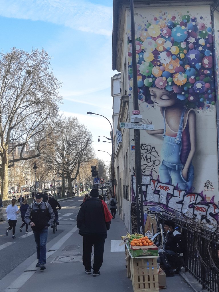 Lundi. Pas de soleil. Nuages gris. Masque, casque, lunettes sur les cheveux (il fait frais, buée). Je flâne dans les rues du Sentier en écoutant Ferré, et d’autres que je ne connais pas, chantant Apollinaire. Rues quasi désertes, volets baissés, mannequins aux jolies robes, qui, dans leurs vitrines, n’attendent personne. Livreurs, colleurs d’affiches, et, dans une petite rue transversale de la Saint-Denis, des dames qui, elles, attendent. Rue d’Aboukir. Place des Victoires, l’iphone 12 nouveau défie Louis 14. Plus loin, la Banque de France, qui semble morte d’inanition. Devant l’église Saint-Eustache, des magnolias en boutons, qui me rappellent les printemps dans notre jardin de Strasbourg. Des corbeaux croassent et la canopée renvoie leur écho. Paris silencieux, Paris sans cieux.