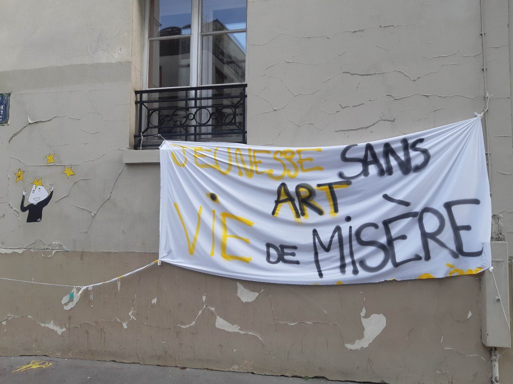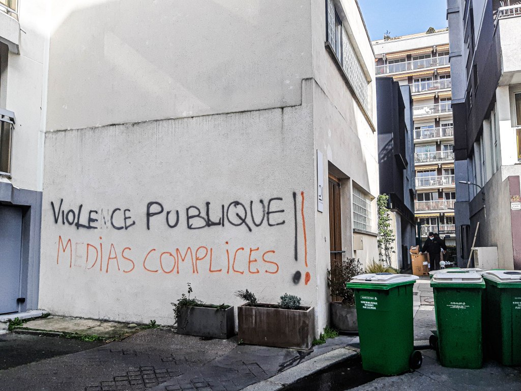 Sur un mur, cette inscription, en deux couleurs « Violence publique ! Médias complices ! ». Que veut-elle dire ? Je ne le sais trop. Je suppose que la « violence publique » désigne la brutalité des forces de l’ordre, souvent critiquée ces derniers mois. « Médias complices ». Ces attaques généralisantes sur les médias, venant aussi bien de l’extrême-droite que de l’extrême gauche, m’agacent de plus en plus. Elles sont devenues caricaturales. Le Chomsky du pauvre. L’extrême-droite pousse la critique des médias pour promouvoir ses propres organes de « réinformation », qui, bien entendu, sont des organes de propagande. Etant donné le quartier, je pense que les inscriptions, ici, émanent plutôt de quelques activistes d’extrême-gauche, des anarchistes peut-être. On leur a connu plus de talent dans le cri public.