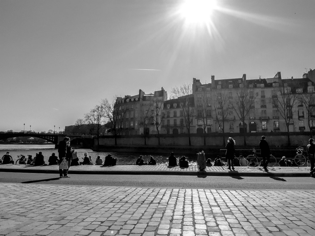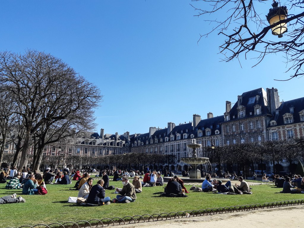 Le 6 mars, il faisait un beau soleil de fin d’hiver. Nous avons fait notre première promenade depuis des mois. J’ai pris deux photos, l’une Place des Vosges, l’autre du Quai d’Anjou, vu de l’ancienne Voie Georges Pompidou. Après des mois d’enfermement face à l’ordinateur, aux miasmes trumpistes que je m’acharnais en vain à analyser, c’était comme un réveil. J’étais tellement enthousiaste que j’ai posté d’emblée sur Facebook a banale photo de jeunes assis sur la pelouse de la Place des Vosges et son succès a été immédiat. Le fait que la plupart de ces gens ne portaient pas de masque n’a suscité aucune observation.
