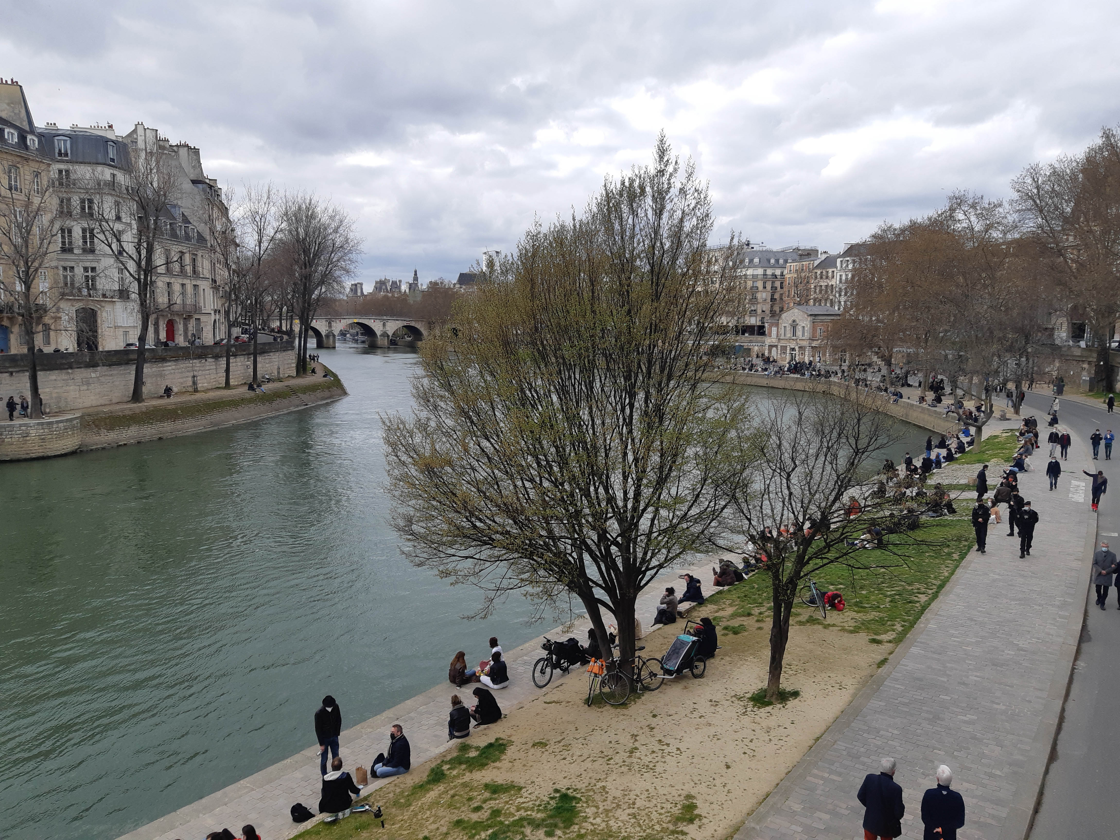Allons, allons, ne sois pas si chagrin. Tu as de la chance. Paris est si belle. On y fais la queue sur les trottoirs pour se faire vacciner mais aussi pour acheter des beignets chez Bestie Bakery, rue des Bernardins ; la promenade Quai d’Anjou a son charme éternel et les amoureux amoureuses sont au rendez-vous ; tu pourras envoyer une photo du chantier de Notre-Dame à ton cousin d’Amérique ; saisir Ronsard devant un magnolia en fleurs ; piquer dans une librairie un marque-page Printemps des poètes, thème de l’année « Le Désir » ; descendre le Boul’ Mich’ en suivant une séduisante Espagnole ; repasser les ponts sous la brise; revoir la Tour Saint-Jacques et ses secrets. Te voilà Rue de Rivoli. Il se fait tard. L’heure du couvre-feu est déjà tombée, mais tout le monde s’en fiche. Rue Vieille du Temple, dans l’entre-chien-et-loup de la transgression, des groupes de jeunes sans masque festoient, bouteille à la main. Tu les contournes, agacé et pourtant jaloux. Rue Oberkampf, le marchand des quatre-saisons n’a pas encore rangé son étalage de fruits multicolores, éclatants sous l’éclairage. Tu es en retard, tu portes tes lunettes sur tes cheveux et tout est un peu flou, mais tu vois bien que dans ce restaurant des gens sont attablés et qu’il n’y a pas un seul Gardien de la Paix dans le quartier. Tu remontes l’Avenue et là-haut par delà les lignes noires des frondaisons, avant de rentrer dans ton cosy, tu admires la plus merveilleuse des pleines lunes.