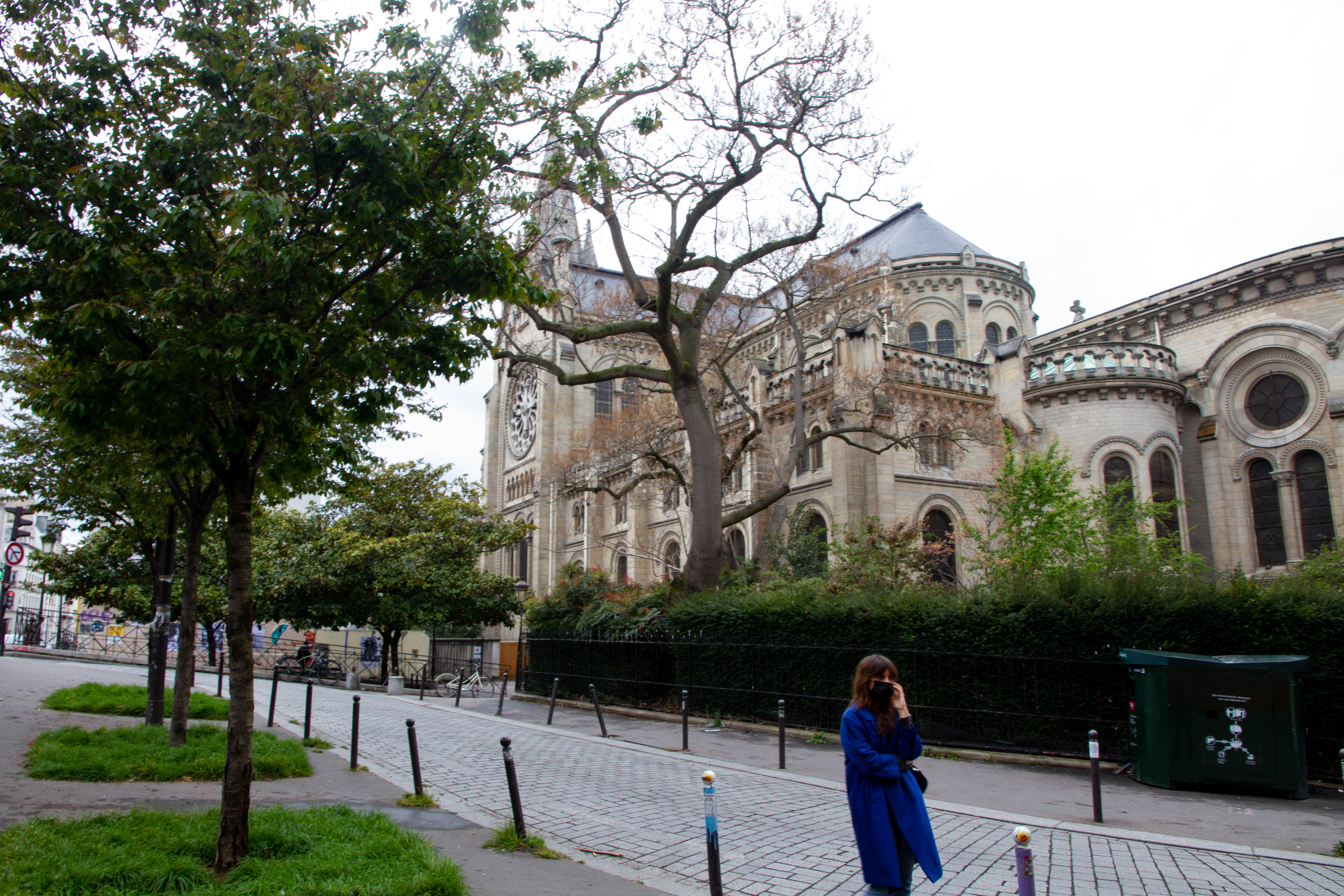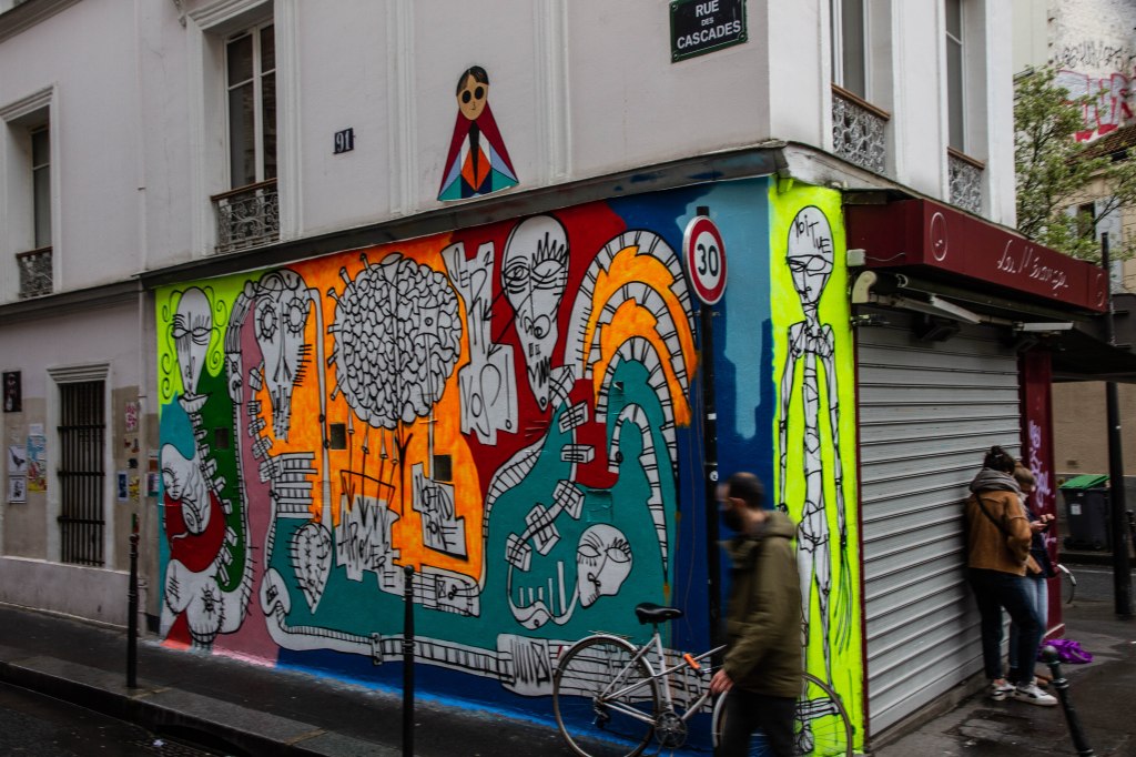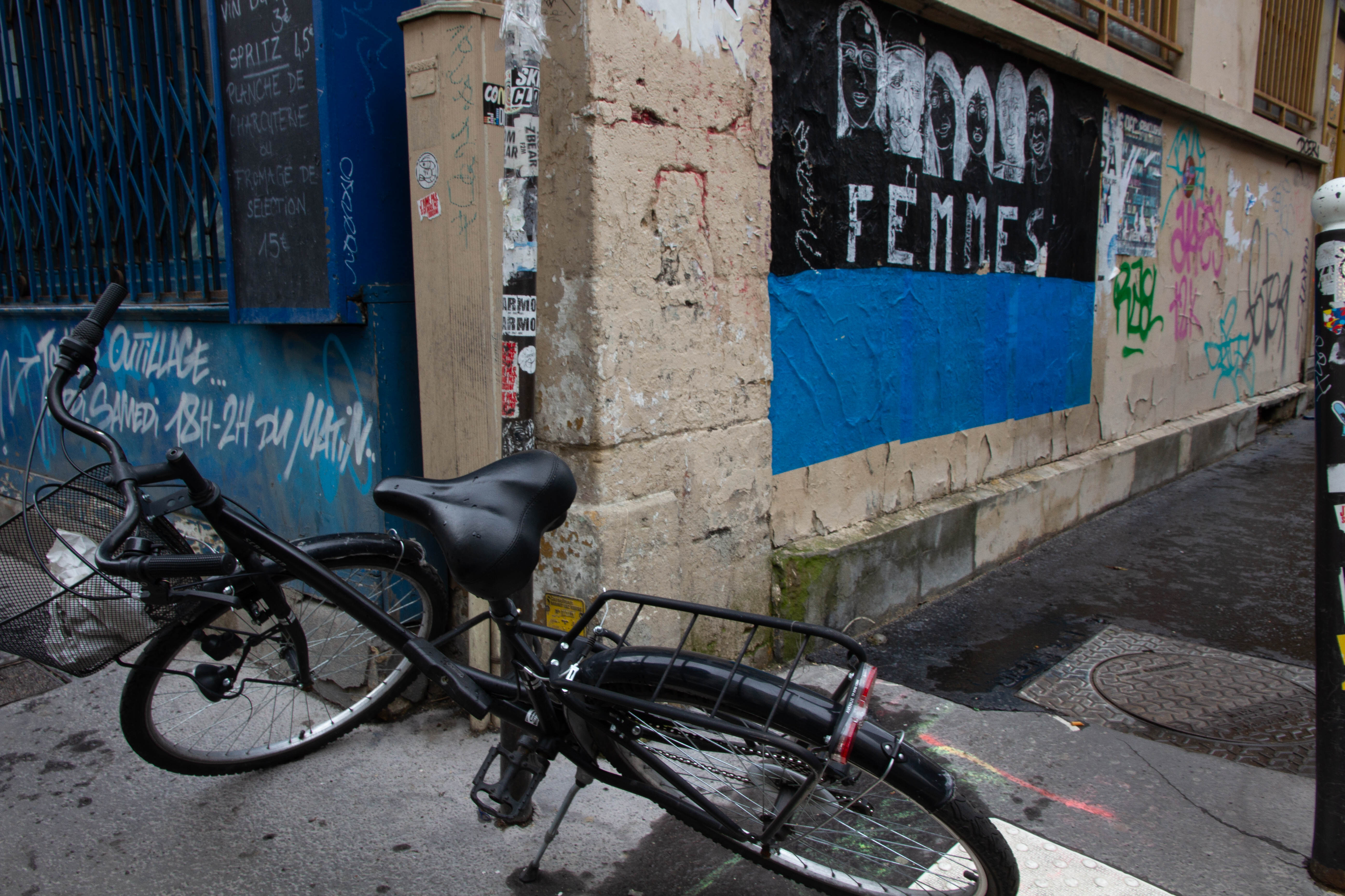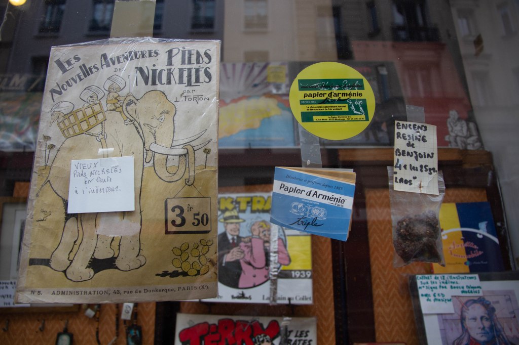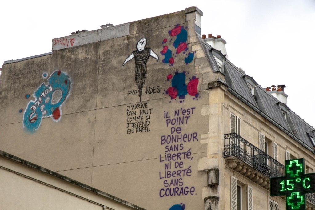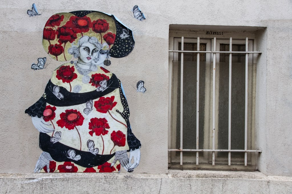 Face à l’Eglise Notre-Dame de la Croix se cache une jolie petite librairie, qui est aussi une maison d’édition Le Monte en l’Air. Je fume un petit cubain en observant le clochard du coin et une intéressante peinture murale au-dessus du garage de la Rue d’Eupatoria.