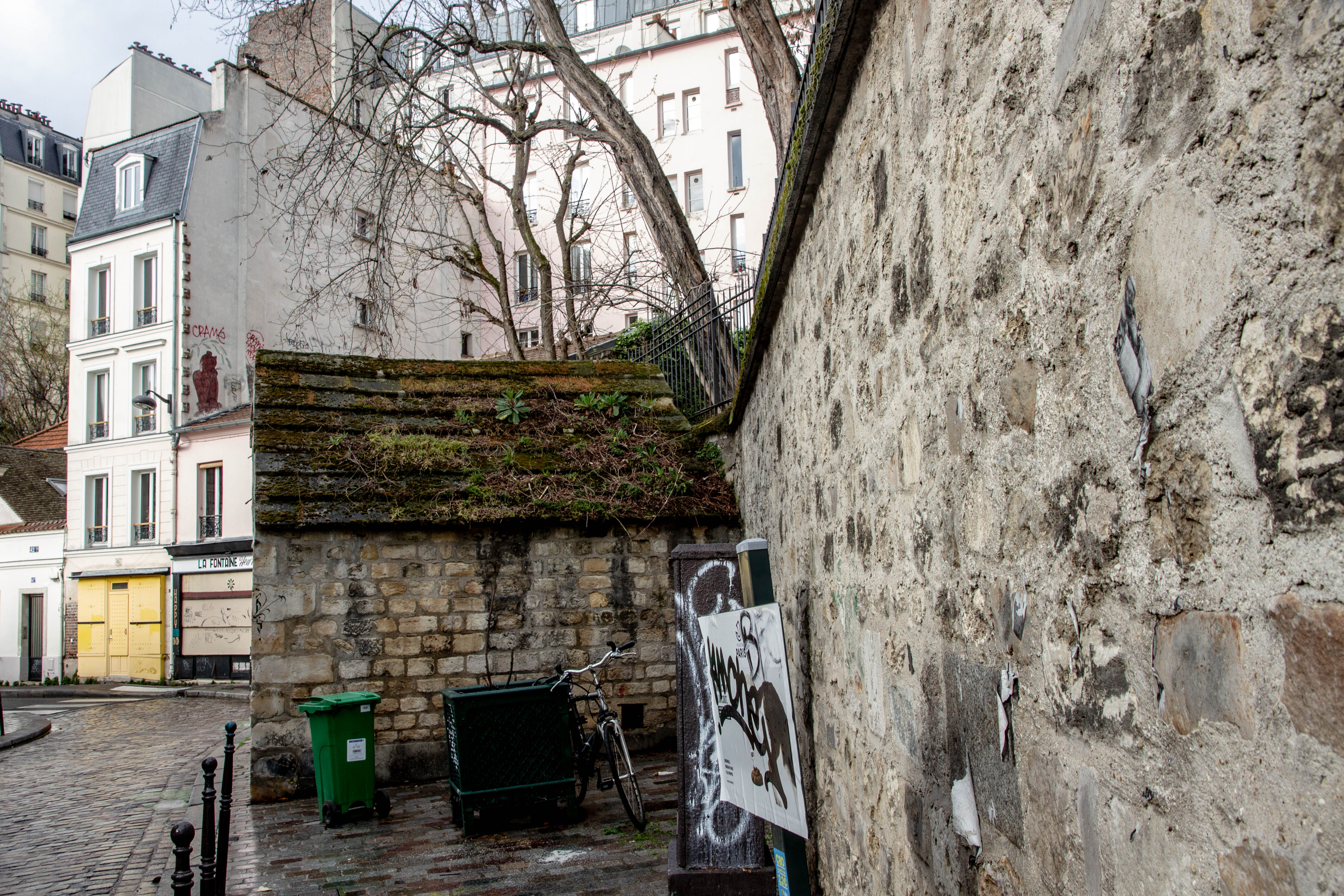 Rue de la Mare, il y avait réellement une mare. Des chutes d’eau avaient été aménagées pour recueillir les eaux de Belleville et les conduire dans le regard Saint-Martin, cette petite construction de pierre qui est en bas de la rue de la Cascade, riche en oeuvres de street art. J’aurais dû mieux me documenter avant de me mettre en route. Je rate l’inscription en latin, qui explique : « Fontaine coulant d’habitude pour l’usage commun des religieux de Saint-Martin de Cluny et de leurs voisins les Templiers. Après avoir été trente ans négligée et pour ainsi dire méprisée, elle a été recherchée et revendiquée à frais communs et avec grand soin, depuis la source et les petits filets d’eau. Maintenant enfin, insistant avec force et avec l’animation que donne une telle entreprise, nous l’avons remise à neuf et ramenée plus qu’à sa première élégance et splendeur. Reprenant son ancienne destination, elle a recommencé à couler l’an du Seigneur 1633, non moins à notre honneur que pour notre commodité. Les mêmes travaux et dépenses ont été recommencés en commun, comme il est dit ci-dessus, l’an du Seigneur 1722 ».