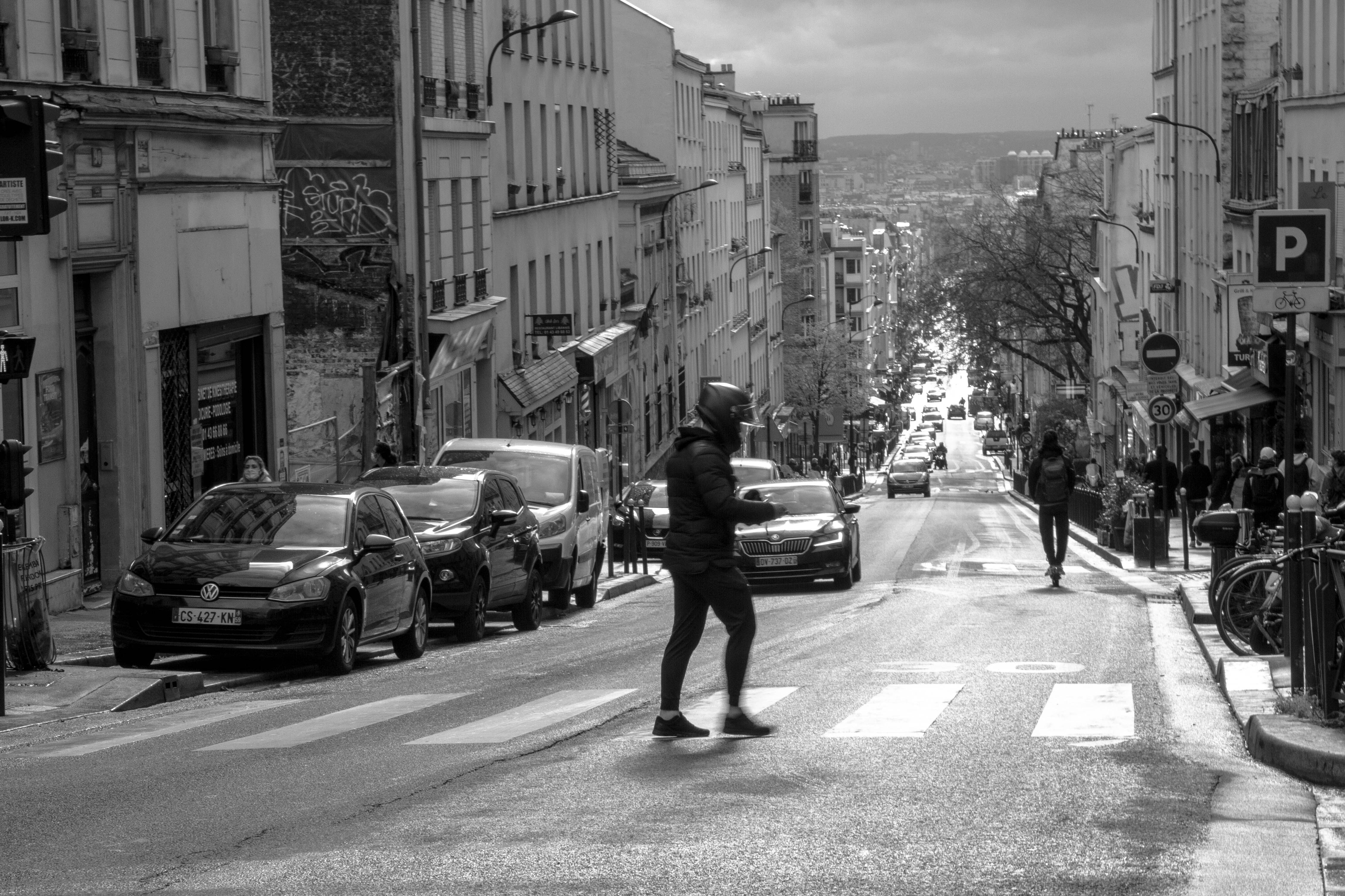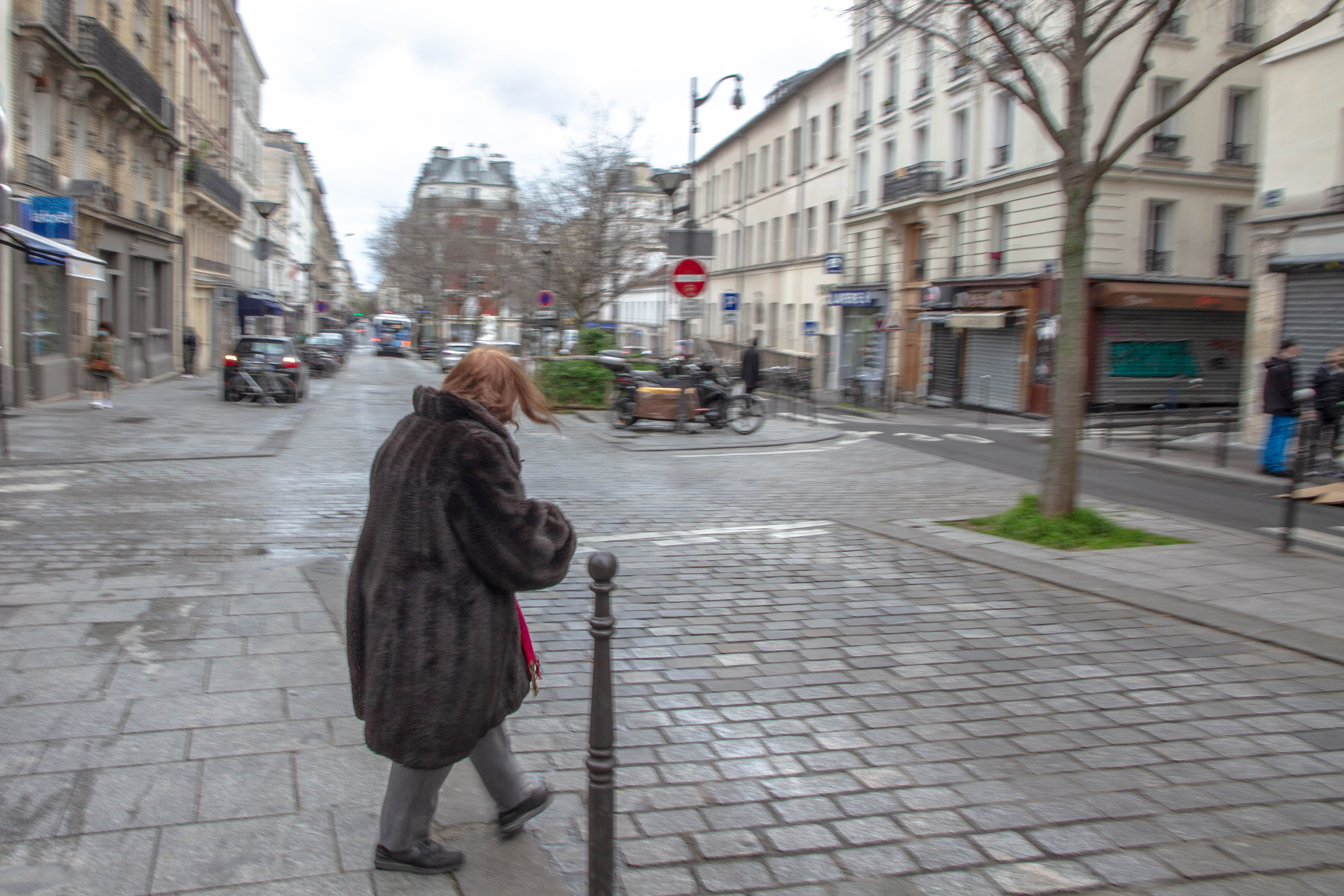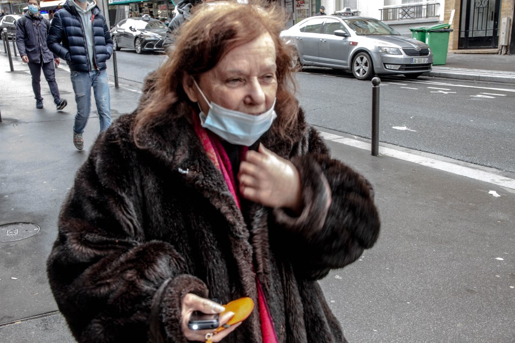 Je photographie une petite dame en fourrure. Quelques minutes plus tard, alors que je suis occupé à analyser l’offre de livres dans une de ces librairies, la petite dame vient vers moi et me demande sur un ton ironique « Vous allez vous convertir ? Il faut entrer à l’intérieur, mais la librairie un peu plus haut est encore mieux« . J’interromps Frehel, qui était en train de chanter dans le casque. La petite dame a visiblement envie de faire causette. Elle me raconte qu’elle a fait mai 68. « Je n’étais pas étudiante, mais je courrais sur le boulevard Saint-Michel avec mon frère. C’était un grand bouleversement. Mes parents ne comprenaient pas ». Je lui dis que j’ai commencé à me sentir vieillir lorsque j’ai réalisé que mes étudiants et étudiantes étaient né en 68. Elle m’explique que le quartier change beaucoup. « Beaucoup de commerces ferment. Surtout ceux qui étaient tenus par des vieux. Ils partent sans dire au revoir. Peut-être vont-ils s’installer dans le midi ». Son frère faisait de la photographie en Camargue. Je lui demande si je puis la photographier. L’idée l’amuse. « Est-ce que je dois mettre mon masque ?« . Je lui réponds que c’est dommage que les masques masquent les visages, mais que, finalement, du point de vue photographique, c’est un élément intéressant, qui fait époque.