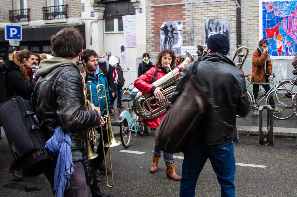 Je ne m’attarde pas. Je descends par la rue Henri-Chevreau où quelques affichent commémorent la Commune de Paris. Au croisement avec la Rue de la Mare, une voiture de police, face à la librairie Jargon libre, « Lieu d’archive, d’étude et de conspiration », bloque l’accès. Que se passe-t-il ? Un incendie, un meurtre, un attentat ? Grand moment d’émotion : une foule joyeuse et festive remonte la rue et une petite fanfare tintamarre Bella Ciao. Cette musique me fend toujours le coeur. Aucun drapeau, aucun panneau de revendication. Quand les trompettes s’arrêtent, des cris s’élèvent « Vive la Commune ! Vive la Commune ! ». Et les musiciens enchaînent avec l Partigiani en remontant vers le Parc. Je les suis un moment dans la rue de la Couronne. La mémoire révolutionnaire a son cours et ma promenade le sien.