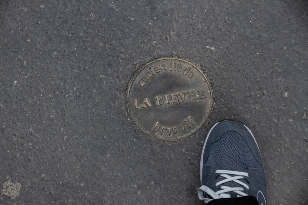 Mina me rejoint. C’est-elle qui me fait remarquer, au sol, Rue de Croulebarbe, la plaque indiquant le cours caché de la Bièvre. Peut-être le narrateur de La femme de trente ans, la Reine Blanche et Jean Gobelin se promènent-ils là-dessous.