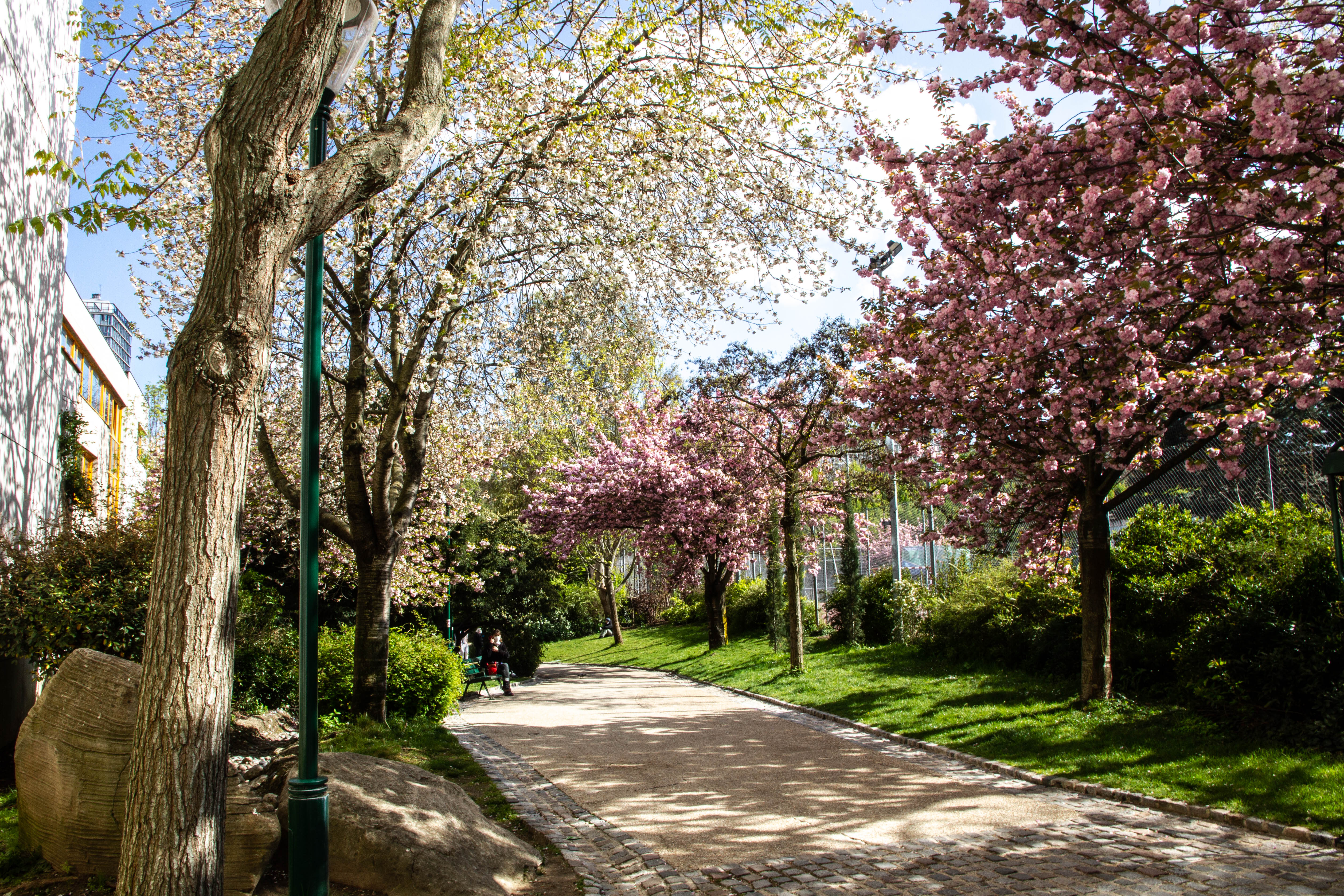 De la rue des Gobelins, je me mets en route vers la Butte aux Cailles. Je longe un instant le Boulevard Arago, « ombragé par de grands arbres touffus », En chemin, alors que que j’écoute, en remontant la Rue des Cordellières, Anne du Cros chantant April in Paris, je découvre le charme des cerisiers en fleurs du Square René-Le Gall.