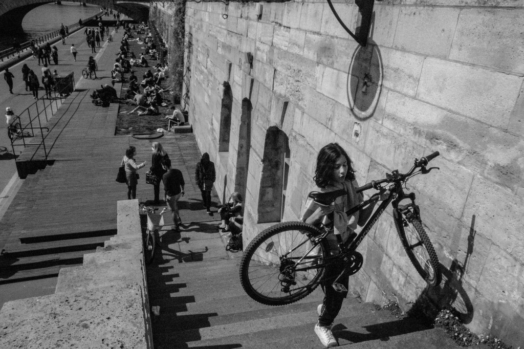 Quelques photographies au vol, réunies dans l’album De quoi se compose Paris. Comme d’habitude, je constate qu’il y a à présent sur les quais plus d’adeptes du vélo, du jogging et du skateboard que du Flâneur des deux rives. Photographier les quais de Paris n’est pas très facile. Une amie m’écrivait gentiment l’autre jour à propos de mes promenades « Formidable tentative d’ épuisement de lieux parisiens … quelle plume ! ». C’est gentil, mais certains lieux sont déjà, depuis longtemps, épuisés, épuisés par les citations, épuisés par les photographies, épuisés par les albums de photographie que l’in trouve d’occasion célophanée chez les bouquinistes. La chronique de la pandémie me permet de les retrouver, d’essayer de mettre à jour le regard, de nous rajeunir un peu. Mais après ?