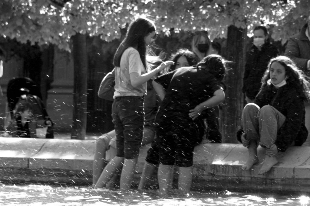 Enfin, les jardins du Palais-Royal. Je pourrais, ici aussi, vivre Paris par procuration. « Mes pensées, ce sont mes catins… ». Mais où est donc le Neveu de Rameau ? Ah, cette analyse magnifique du dialogue par Jean Fabre, publiée chez Droz. Il ne m’est pas nécessaire aujourd’hui. Dieu qu’il y fait bon, assis au soleil près du bassin à photographier de jolies nymphettes qui barbottent dans l’eau fraîche sous les éclaboussures de la fontaine. Elles se feront réprimander par le gardien. Et il y a quelques belles lectrices alentours, qui trouveront leur place dans un autre album, à elles dédié.