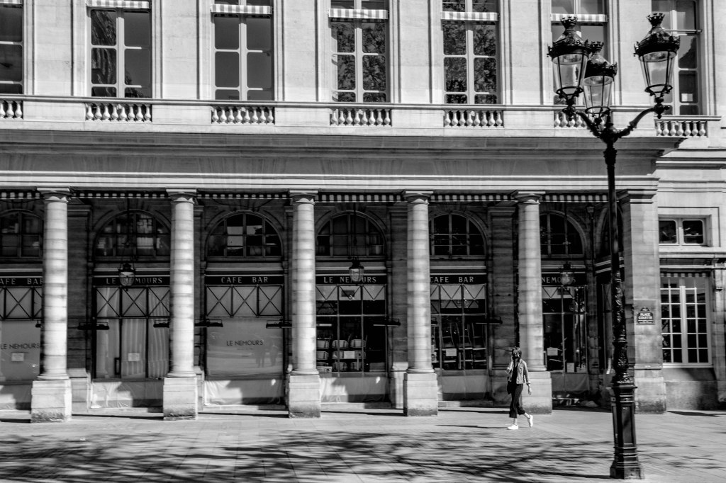 Place Colette, le Café de Nemours, où nous avons l’habitude de manger une glace après la lecture dans le parc du Palais-Royal, est évidemment lui aussi fermé. Passe une élégante.