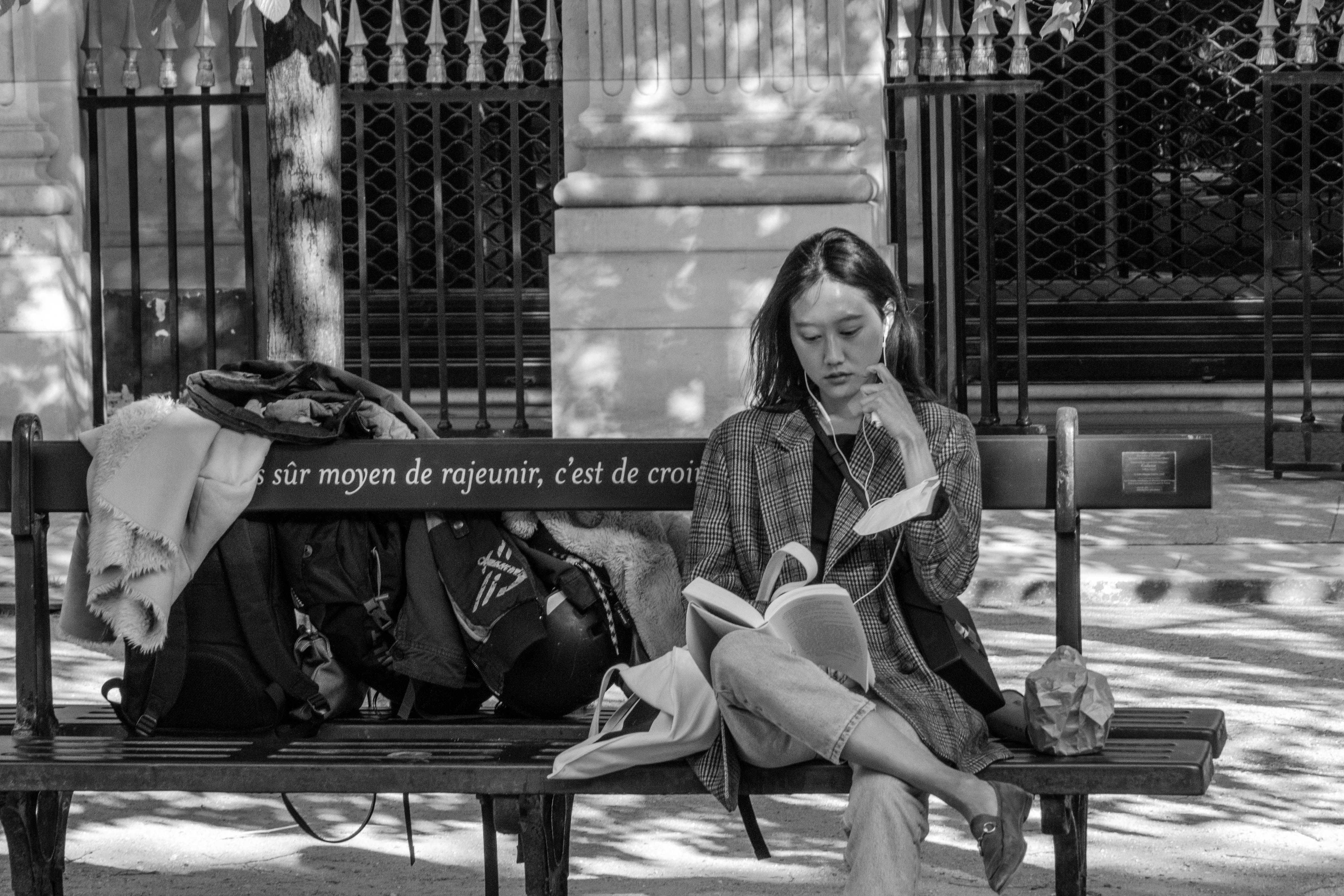 Enfin, les jardins du Palais-Royal. Je pourrais, ici aussi, vivre Paris par procuration. « Mes pensées, ce sont mes catins… ». Mais où est donc le Neveu de Rameau ? Ah, cette analyse magnifique du dialogue par Jean Fabre, publiée chez Droz. Il ne m’est pas nécessaire aujourd’hui. Dieu qu’il y fait bon, assis au soleil près du bassin à photographier de jolies nymphettes qui barbottent dans l’eau fraîche sous les éclaboussures de la fontaine. Elles se feront réprimander par le gardien. Et il y a quelques belles lectrices alentours, qui trouveront leur place dans un autre album, à elles dédié.