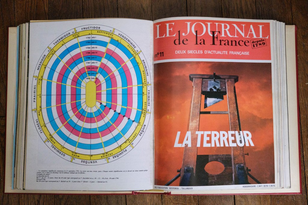 Mai 68 était passé sans que je m’en sois rendu compte. Je me souviens qu’on parlait de « contestataires » et de la vague des cols Mao, mais je n’avais à l’époque, aucun intérêt pour l’actualité politique. Jean-Pierre non plus. Nous parlions d’histoire. Il était passionné par les « Belles Histoires de l’Oncle Paul », qui paraissaient dans Spirou, et par les récits des pilotes de la R.A.F., moi par les Rois maudits, dans l’édition en six volumes sous couverture de toile verte de la Guilde du Livre, et par la généalogie des Capétiens. Dumas et Hugo commençaient à susciter mon intérêt pour le XIXe siècle parisien. C’est Jean-Pierre qui me fit découvrir, en avril 1969, le Journal de la France depuis 1789, un hebdomadaire, qui, au fil des semaines, racontait la Révolution française, puis l’Empire, puis la Restauration, puis la Monarchie constitutionnelle, puis le Second Empire. C’était plus attrayant que l’Encyclopédie Alpha ou que l’Histoire universelle des Editions Marabout, en douze volumes. J’avais plaisir à y retrouver le monde découvert au Musée Carnavalet, visité quelques mois plus tôt avec mes parents et dans la lecture de Quatrevingt-treize et de L’Aiglon. Je connaissais quasi par coeur la pièce d’Edmond Rostand, m’étant fait offrir le double disque de l’enregistrement avec Pierre Vaneck dans le rôle titre. L’iconographie du Journal de la France était soignée et mêlait reproduction de documents d’époque et photographies contemporaines des lieux d’action, ce qui contribua à mon goût de la « vérification ». Jean-Pierre avait lui un certain goût macabre pour la violence révolutionnaire et je me souviens l’avoir réprimandé, début juillet 1969 pour avoir épinglé au mur de sa chambre la couverture du N°11, paru le 24 juin : c’était celle de la livraison sur la Terreur, un guillotine incrustée sur un fond de ciel d’un orange qui évoquait plus des flots de sang qu’un tranquille coucher de soleil.