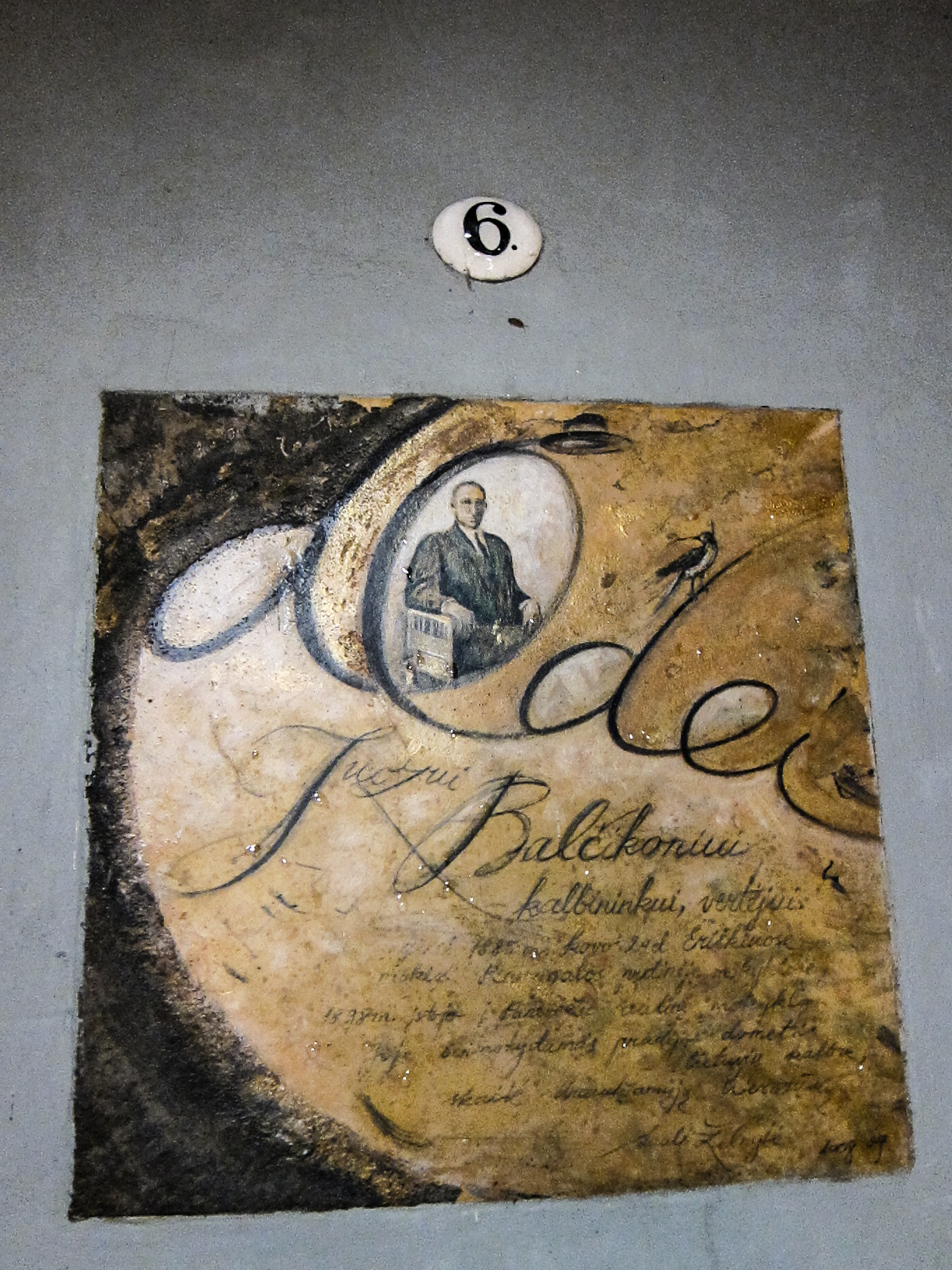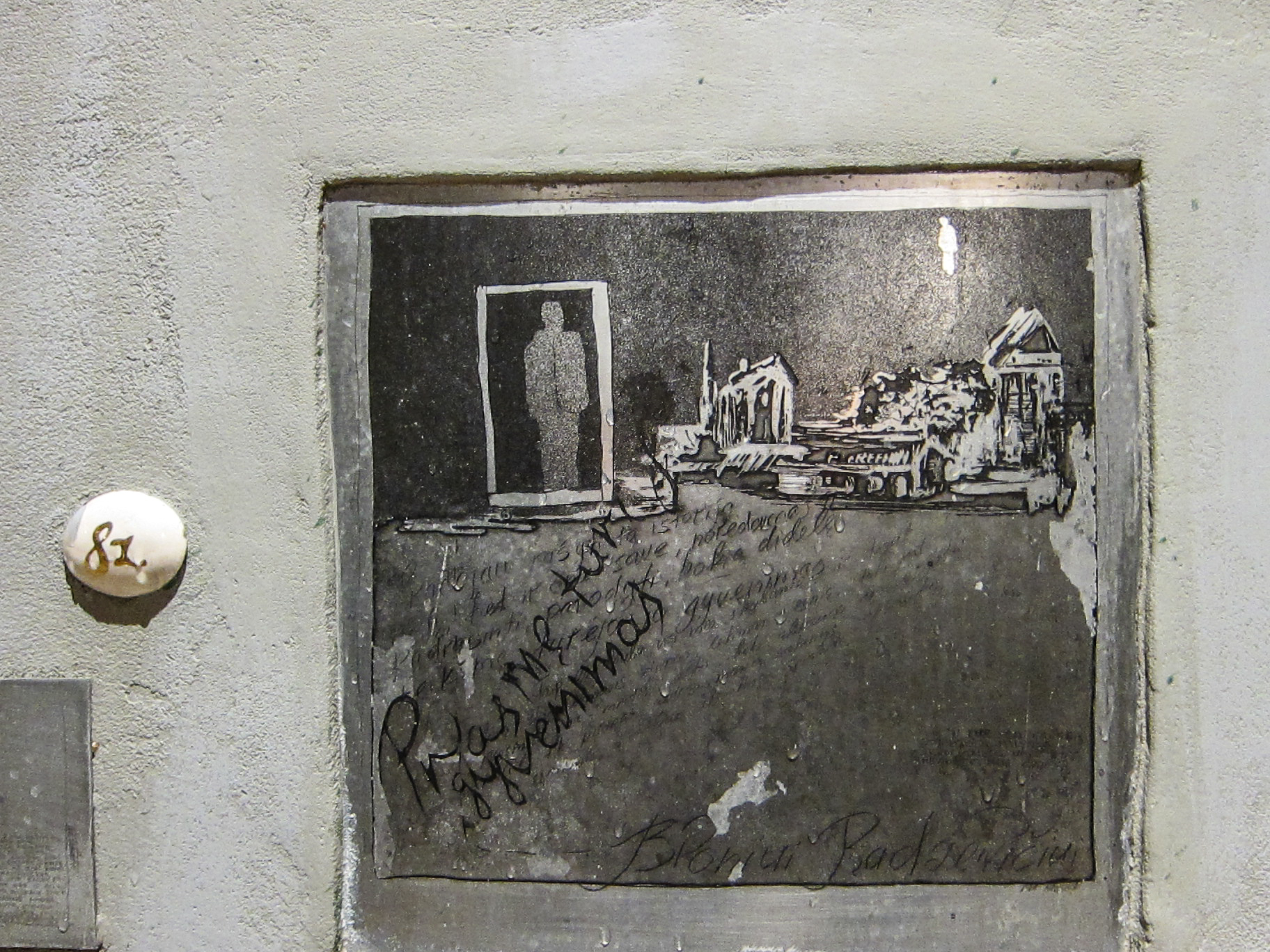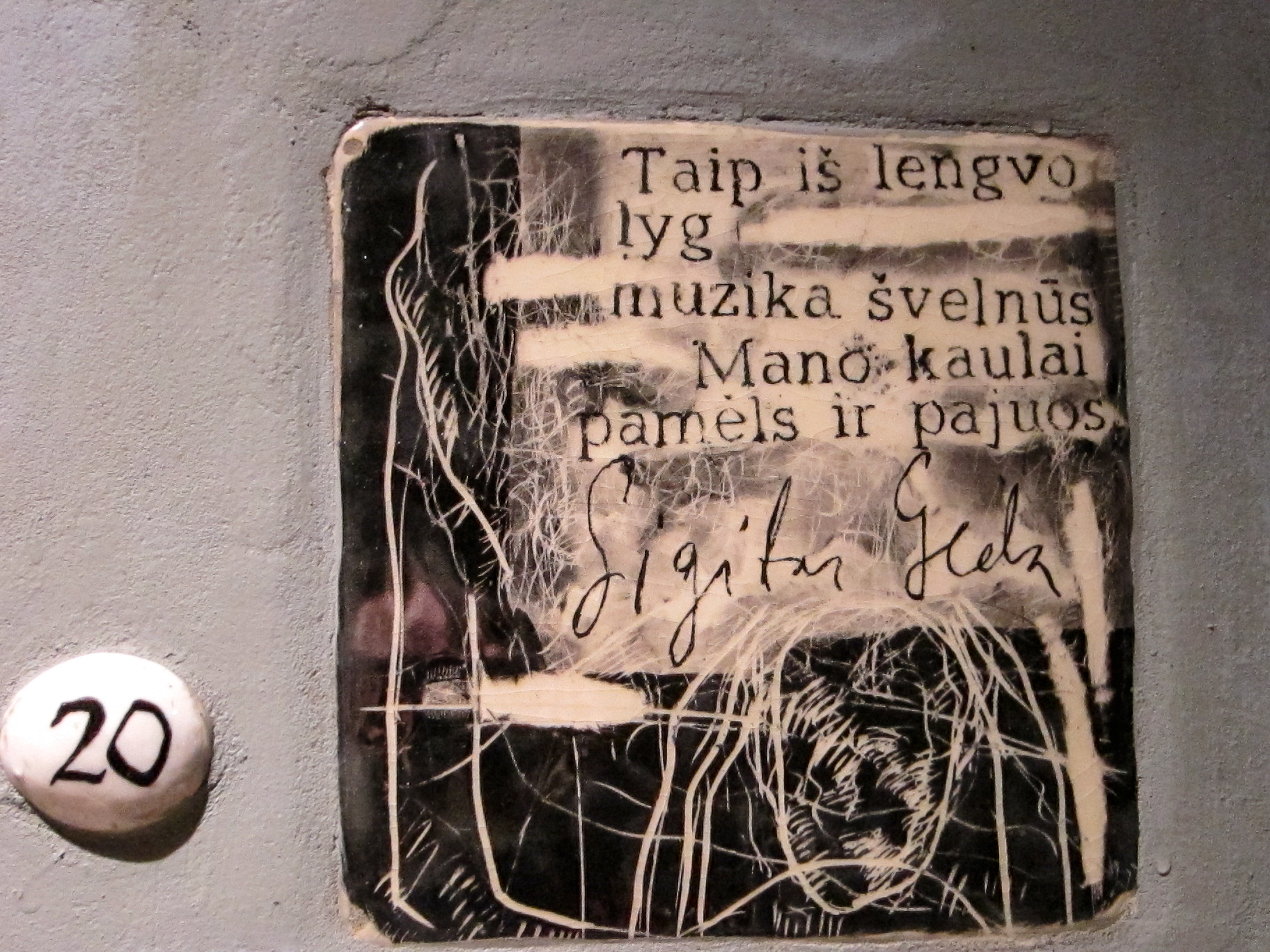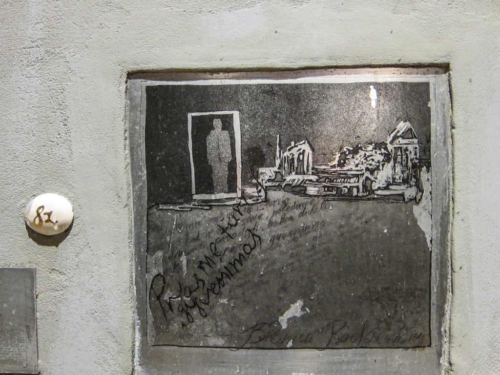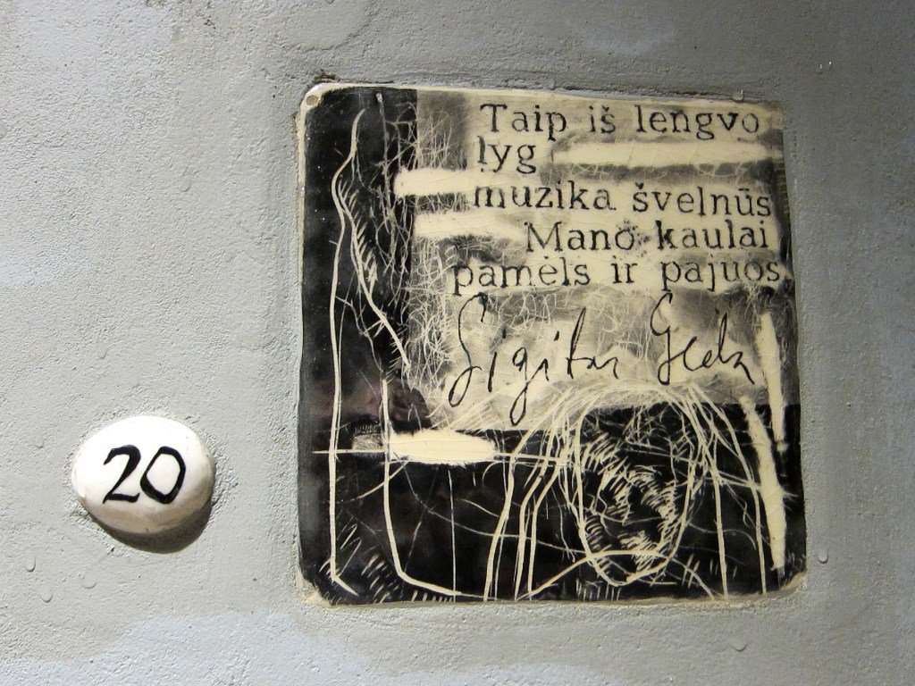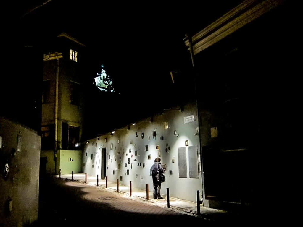 Je retrouve dans mes archives une série qui date de septembre 2010 et que je n’avais pas eu le temps de traiter à l’époque. La série présente (de manière incomplète), les oeuvres du « Mur de la littérature » de la Rue de la littérature à Vilnius. Plus de 180 oeuvres de petit format, recourant à des matériaux et des styles divers, évoquent des écrivains qui sont originaires ou ont vécu à Vilnius. Beaucoup de noms nous sont évidemment inconnus, mais l’on repérera néanmoins dans la liste Jurgis Baltrušaitis, Josef Brodsky, Romain Gary, Jonas Mekas, Czesław Miłosz, Adam Minkiewicz. Les photos ne sont pas d’une très grande qualité. Elles ont été prises en vitesse avec un petit compact Olympus, de nuit, avec un mauvais éclairage dont il m’a fallu éliminer le jaune ravageur. Toutes ces oeuvres ne sont pas de qualité égale, mais j’ai trouvé l’idée très belle. Je me demande si d’autres exemples existent dans le monde ou si il s’agit d’un concept né à Vilnius. Est-il trop tard pour en importer l’idée à Liège ?