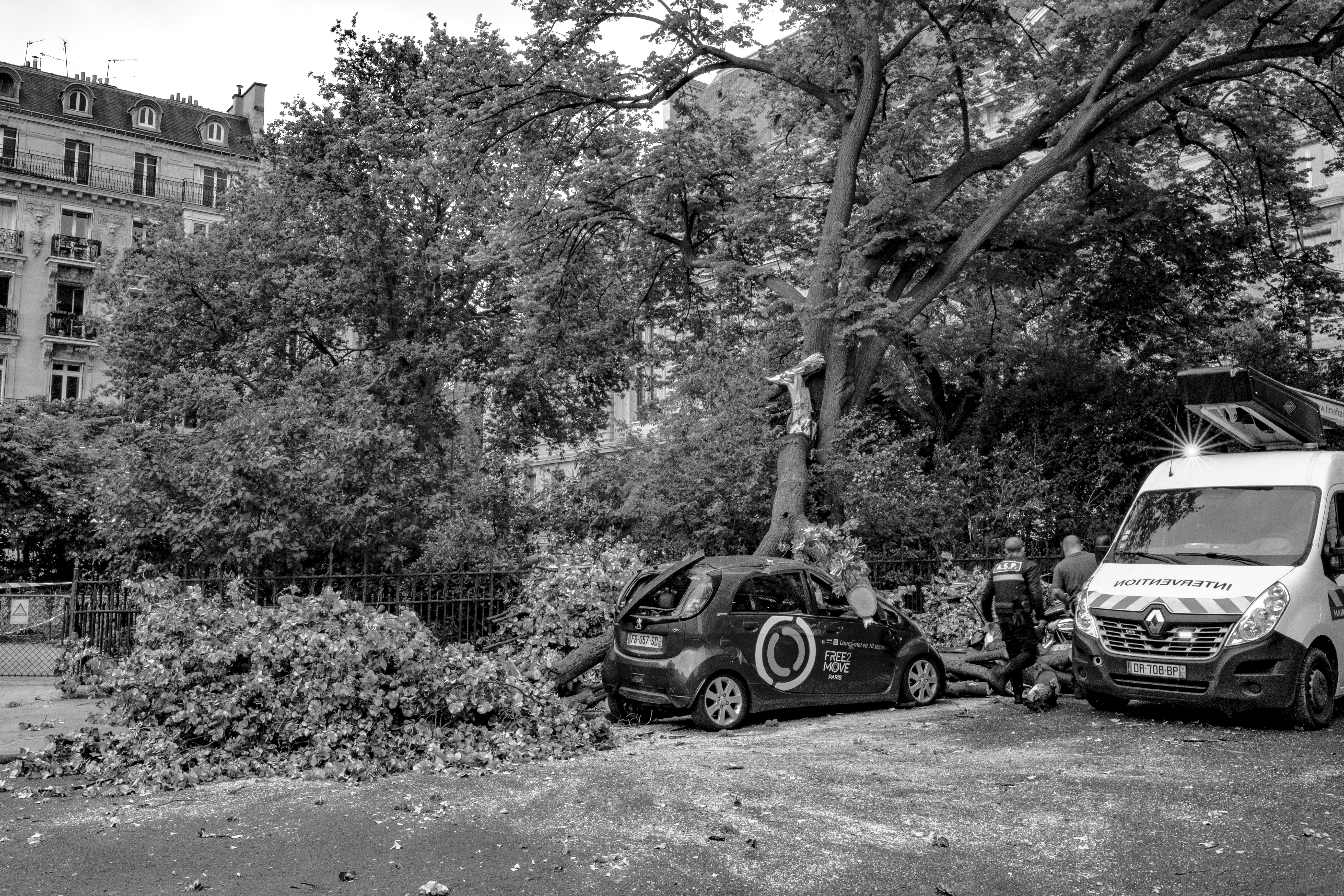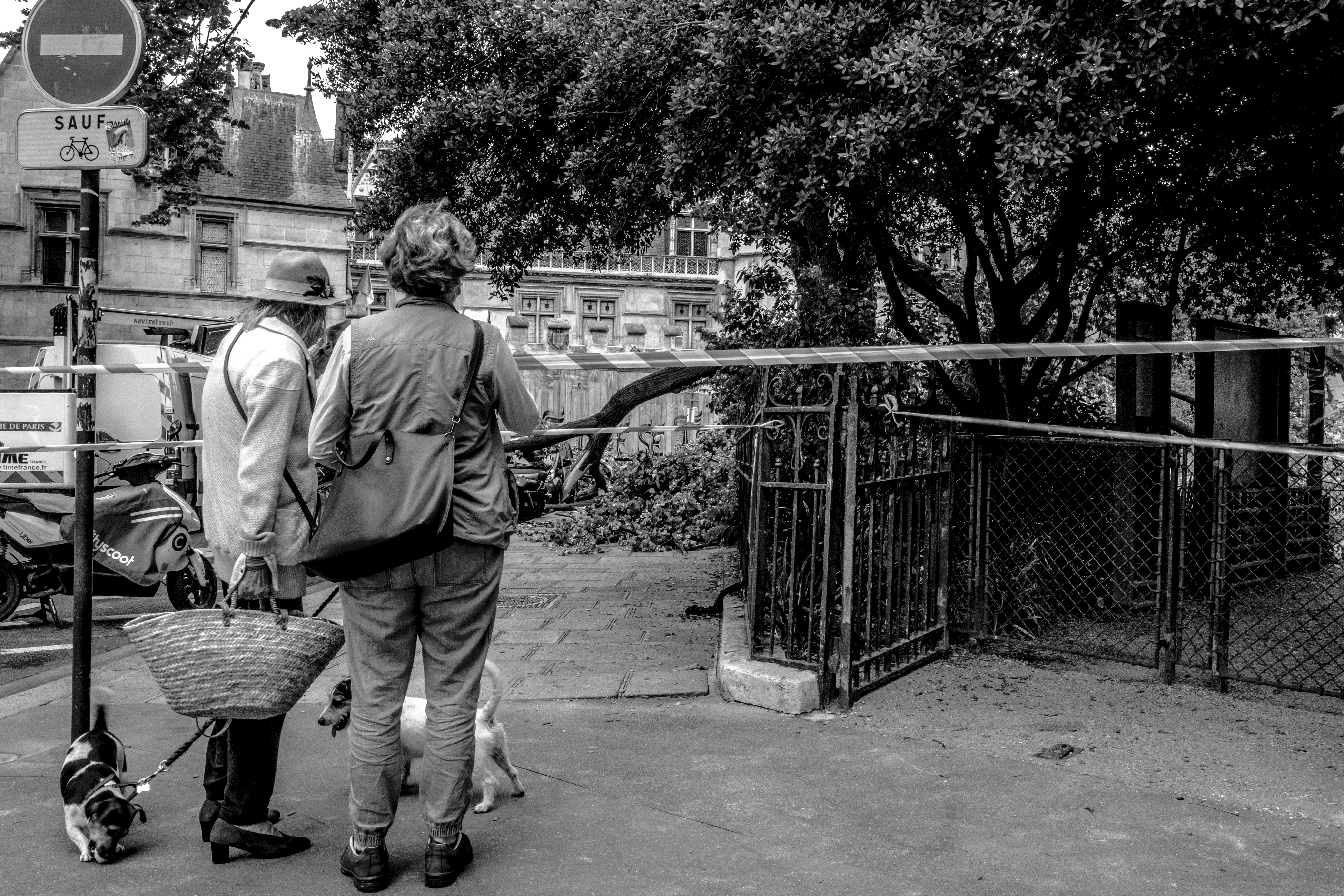 Itinéraire assez classique : métro Arts et Métiers, Rue Saint-Martin, rue Quincampoix, Boulevard de Sébastopol, Place Dauphine, Square du Vert-Galant et Boulevard saint-Michel. Je suis assez content de quelques uns des clichés du jour, mais l’événement, c’est une solide branche d’arbre du Square Paul Painlevé, entre Musée de Cluny et Sorbonne, qui, foudroyée, est tombée sur une Peugeot électrique, à coup sûr bonne pour la ferraille. Une vielle dame du quartier, venue constater les dégâts, se lamente ! « C’est mon arbre ! ».