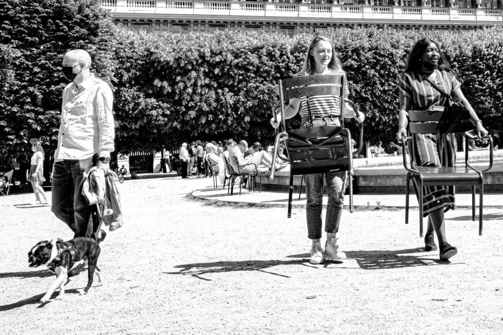 Après-midi au Palais-Royal. J’essaye de maîtriser les multiples fonctions du Fuji XT-4. Quelle bête compliquée. J’ai passé une grande partie de la nuit à suivre en vidéo la masterclass de Damien Bernal. Ce gars là connaît ses appareils, explique assez clairement et sans morgue ni emphase la complexité des menus. Les affinements en instantané me paraissent utopiques et il me faudra trouver mes propres réglages de routine. Je fais quelques essais sur le public assis autour du bassin. L’objectif 18 mm sans possibilité de zoom est une contrainte nouvelle pour moi. Beaucoup de bruit dans les images, tant il y a de passants et de passantes sans intérêt. Cela aurait été plus aisé dans les rues durant le confinement.