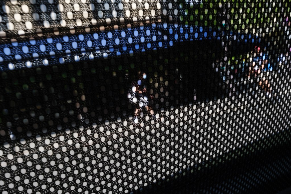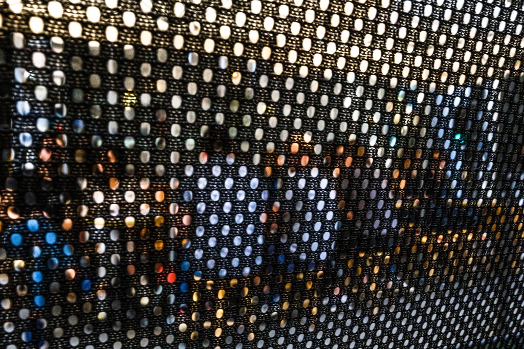 Nous attrapons un taxi devant la Bourse. La fenêtre de gauche est équipée d’un rideau maillé. Je fais un petit essai (avec profondeur de champ complète, focale à 16 et un temps de pause à 1/250ème, ISO 3200). Le résultat n’est pas inintéressant, même si, je suppose, il n’a rien d’inédit. La photographie de rue tend ici vers l’abstraction. Peut-être est ainsi que les gens de pouvoir perçoivent la rue.