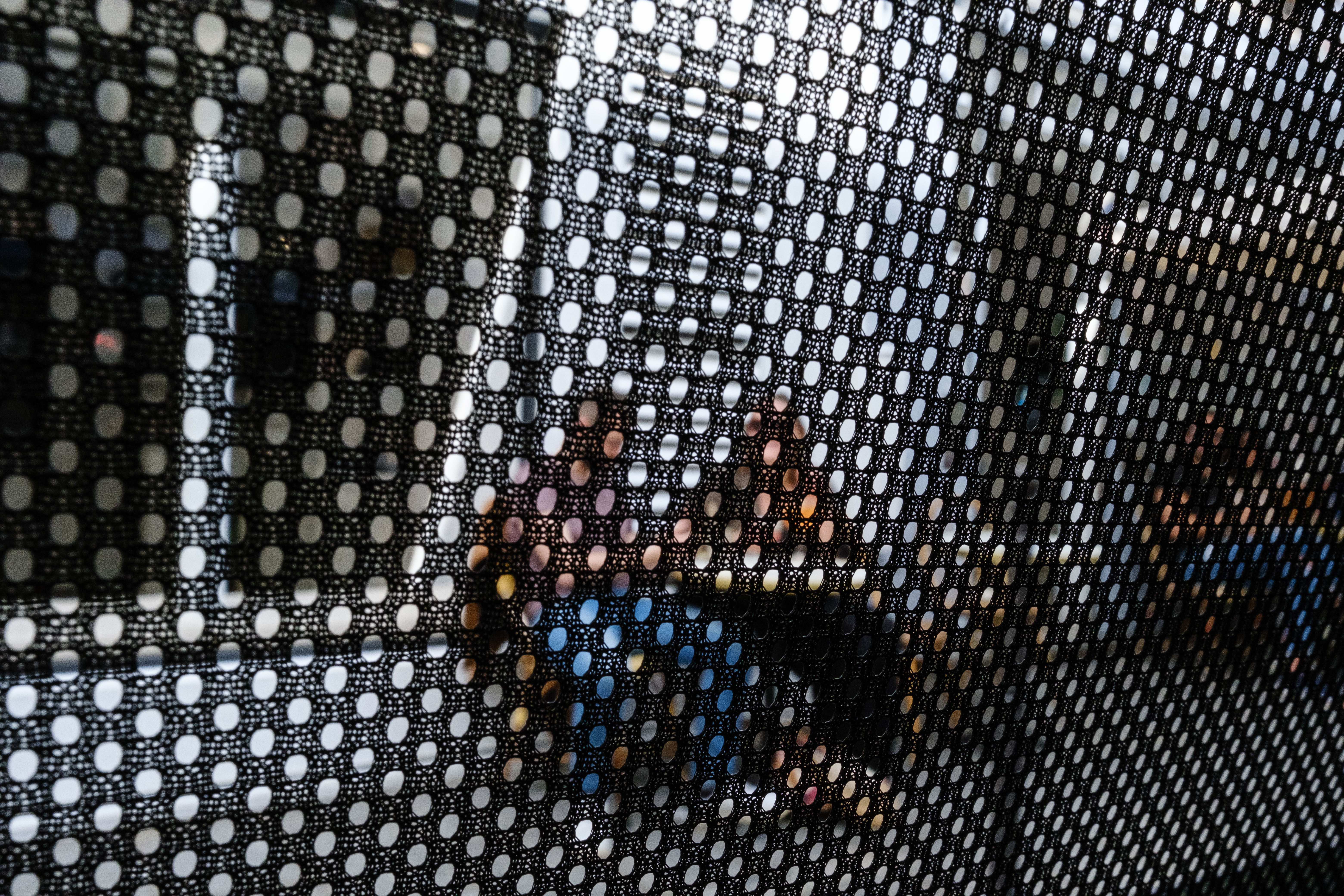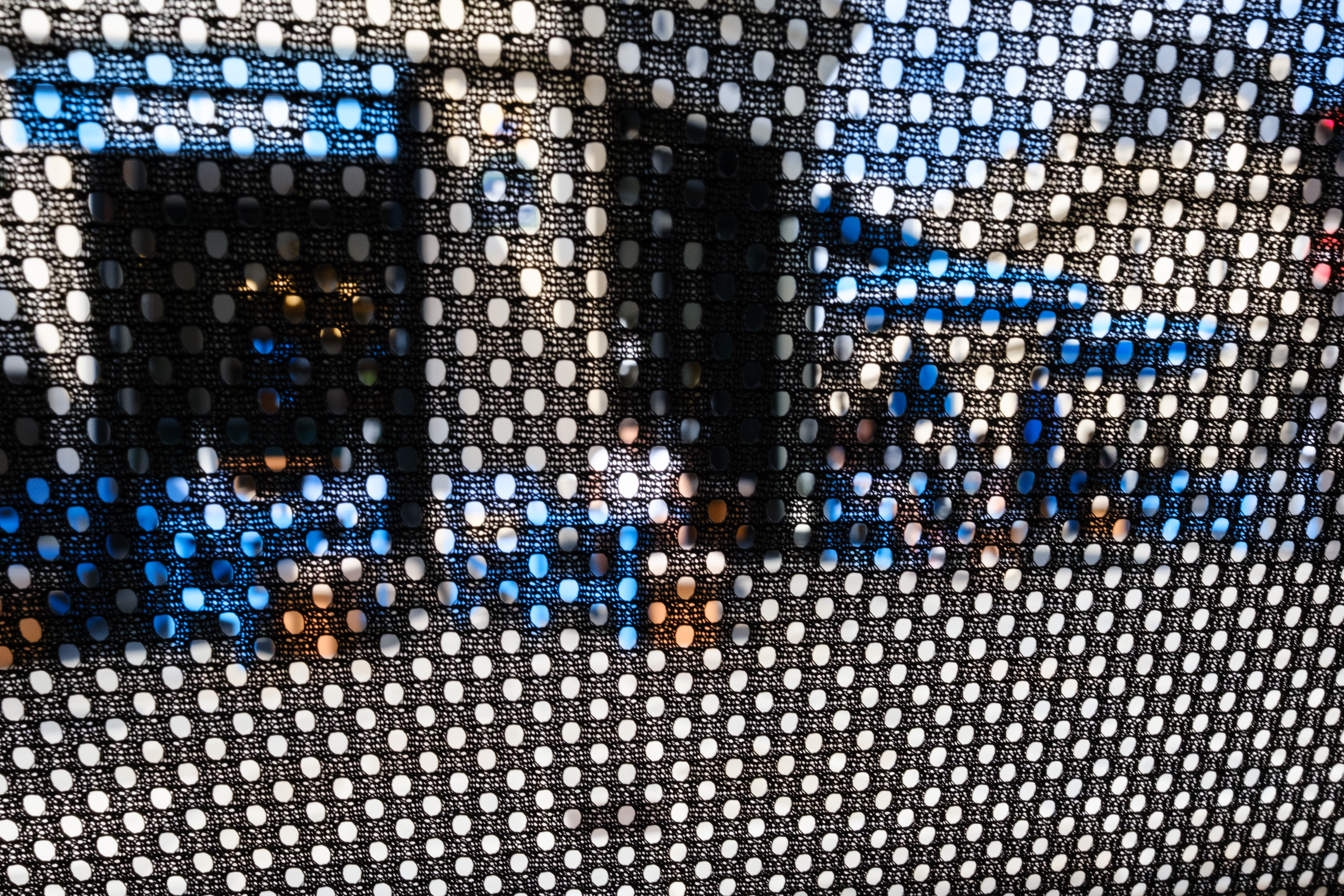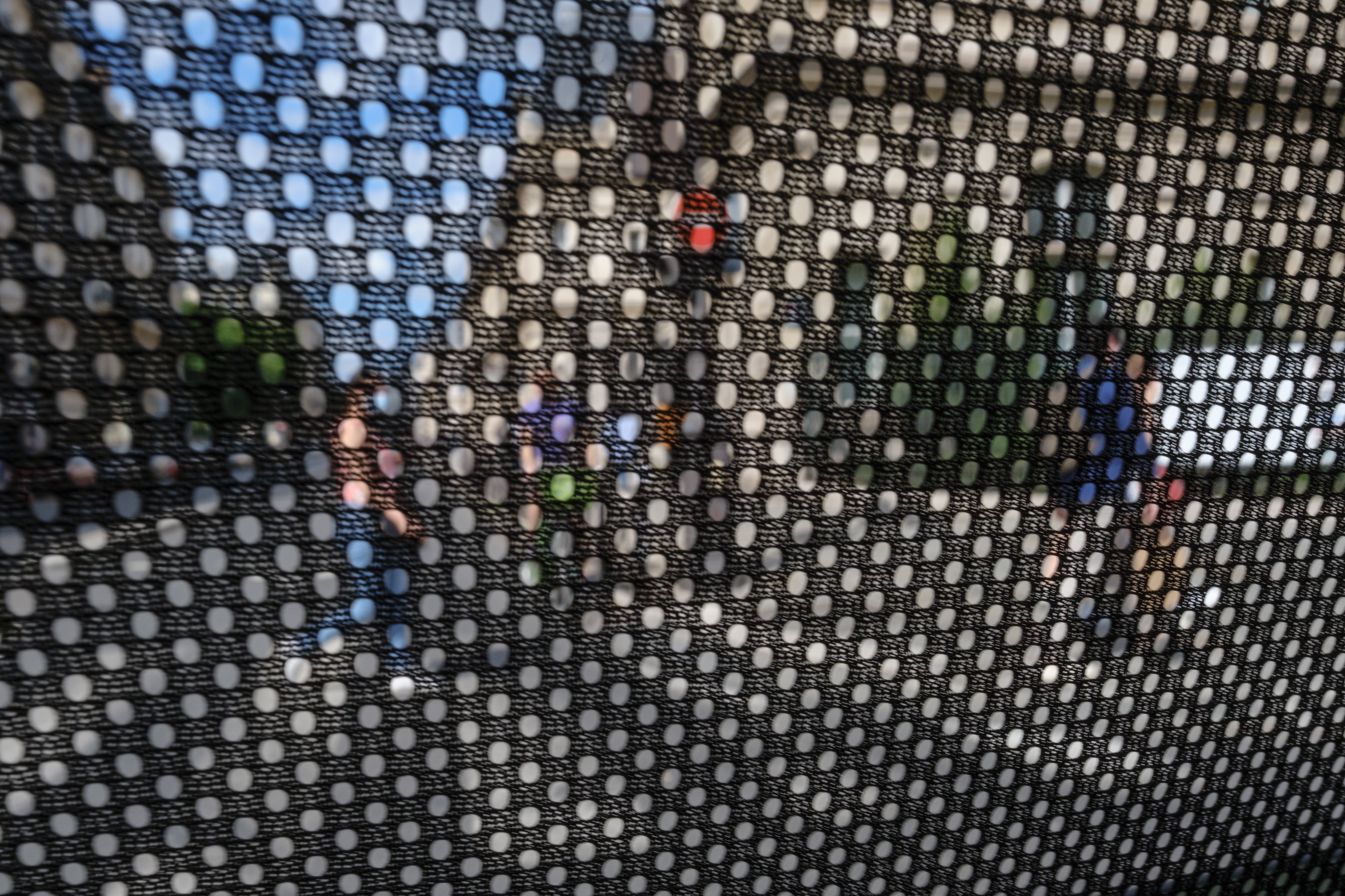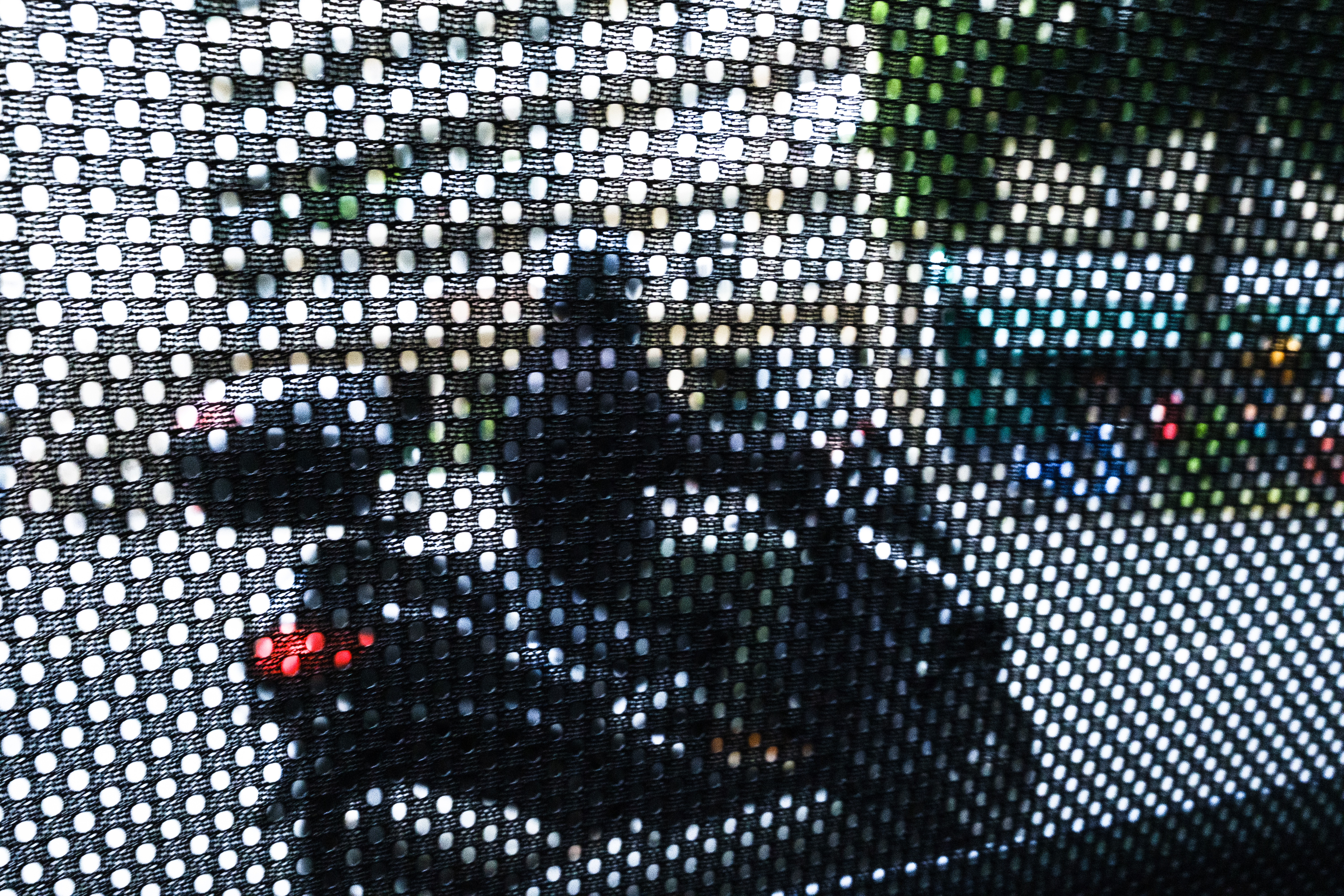 Nous attrapons un taxi devant la Bourse. La fenêtre de gauche est équipée d’un rideau maillé. Je fais un petit essai (avec profondeur de champ complète, focale à 16 et un temps de pause à 1/250ème, ISO 3200). Le résultat n’est pas inintéressant, même si, je suppose, il n’a rien d’inédit. La photographie de rue tend ici vers l’abstraction. Peut-être est ainsi que les gens de pouvoir perçoivent la rue.